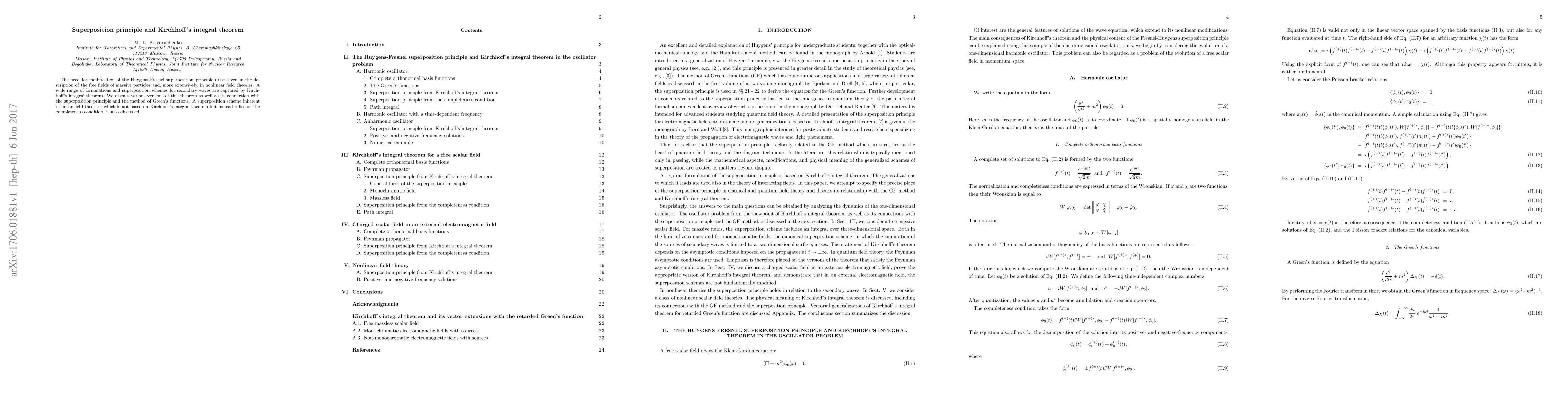 The need for modification of the Huygens-Fresnel superposition principle arises even in the description of the free fields of massive particles and, more extensively, in nonlinear field theories. A wide range of formulations and superposition schemes for secondary waves are captured by Kirchhoff's integral theorem. We discuss various versions of this theorem as well as its connection with the superposition principle and the method of Green's functions. A superposition scheme inherent in linear field theories, which is not based on Kirchhoff's integral theorem but instead relies on the completeness condition, is also discussed.