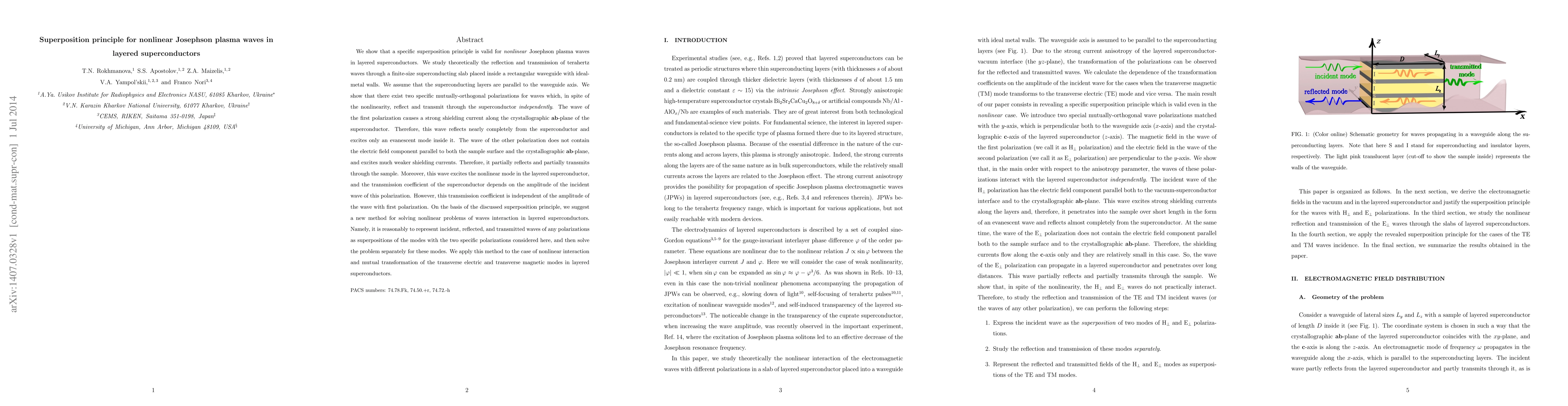 This paper demonstrates a superposition principle for nonlinear Josephson plasma waves in layered superconductors, showing that two mutually orthogonal polarizations reflect and transmit independently through a superconducting slab. It proposes a new method for solving nonlinear wave interaction problems by decomposing waves into these specific polarizations.