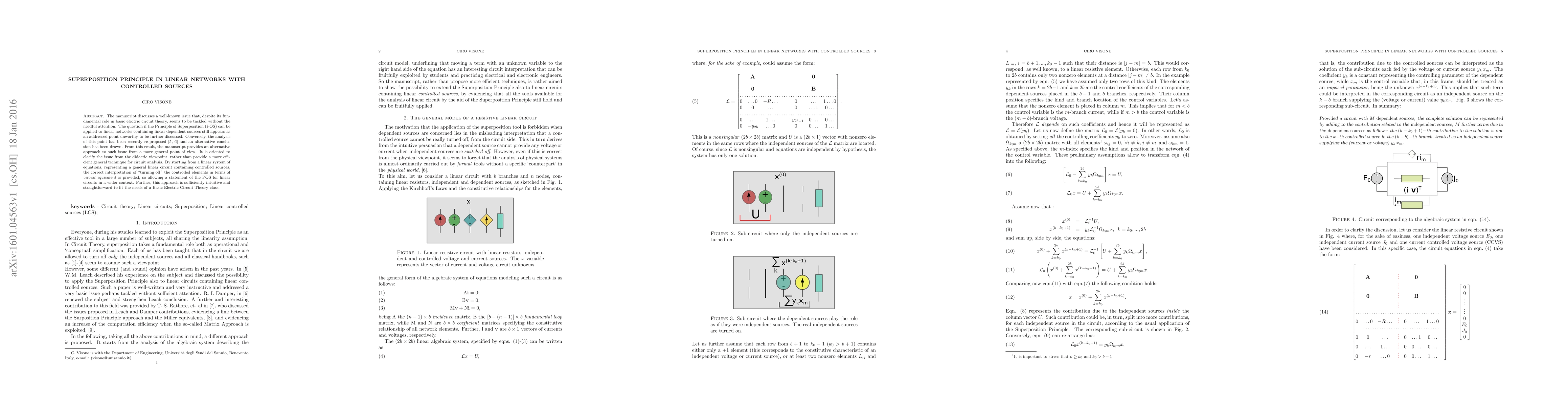 The manuscript discusses a well-known issue that, despite its fundamental role in basic electric circuit theory, seems to be tackled without the needful attention. The question if the Principle of Superposition (POS) can be applied to linear networks containing linear dependent sources still appears as an addressed point unworthy to be further discussed. Conversely, the analysis of this point has been recently re-proposed [5,6] and an alternative conclusion has been drawn. From this result, the manuscript provides an alternative approach to such issue from a more general point of view. It is oriented to clarify the issue from the didactic viewpoint, rather than provide a more efficient general technique for circuit analysis. By starting from a linear system of equations, representing a general linear circuit containing controlled sources, the correct interpretation of turning off the controlled elements in terms of circuit equivalent is provided, so allowing a statement of the POS for linear circuits in a wider context. Further, this approach is sufficiently intuitive and straightforward to fit the needs of a Basic Electric Circuit Theory class.