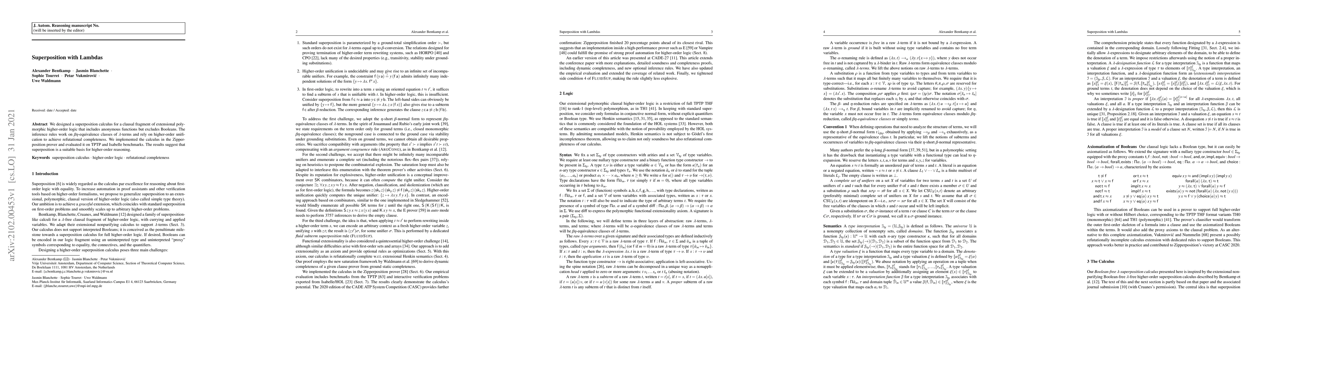 This paper presents a superposition calculus for a clausal fragment of extensional polymorphic higher-order logic, implemented in the Zipperposition prover, and demonstrates its effectiveness on TPTP and Isabelle benchmarks, indicating superposition's suitability for higher-order reasoning.