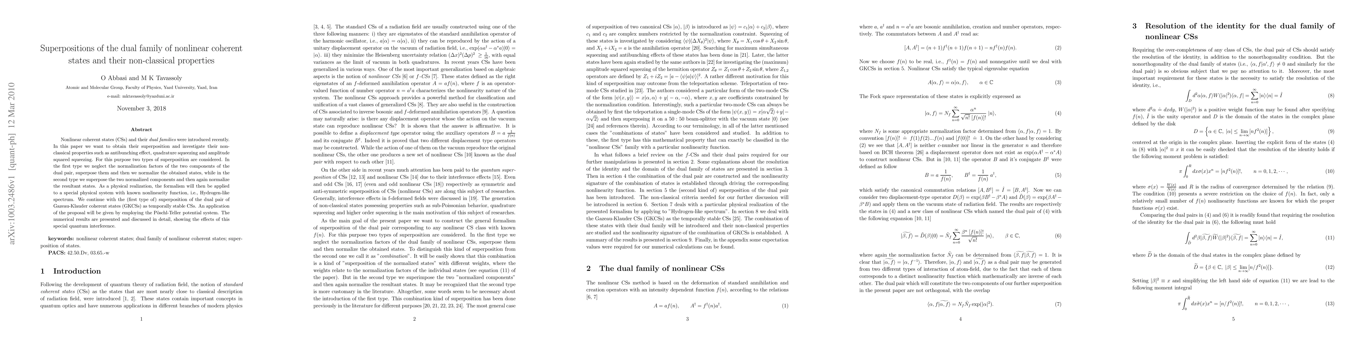 Nonlinear coherent states (CSs) and their {\it dual families} were introduced recently. In this paper we want to obtain their superposition and investigate their non-classical properties such as antibunching effect, quadrature squeezing and amplitude squared squeezing. For this purpose two types of superposition are considered. In the first type we neglect the normalization factors of the two components of the dual pair, superpose them and then we normalize the obtained states, while in the second type we superpose the two normalized components and then again normalize the resultant states. As a physical realization, the formalism will then be applied to a special physical system with known nonlinearity function, i.e., Hydrogen-like spectrum. We continue with the (first type of) superposition of the dual pair of Gazeau-Klauder coherent states (GKCSs) as temporally stable CSs. An application of the proposal will be given by employing the P\"oschl-Teller potential system. The numerical results are presented and discussed in detail, showing the effects of this special quantum interference.