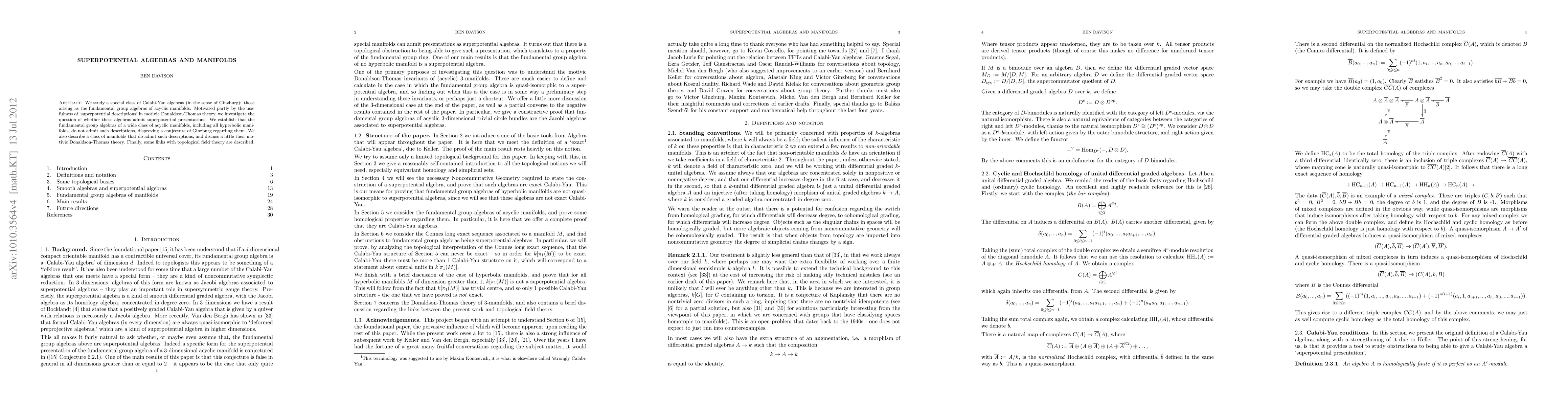 In this paper we study a special class of Calabi-Yau algebras (in the sense of Ginzburg): those arising as the fundamental group algebras of acyclic manifolds. Motivated partly by the usefulness of `superpotential descriptions' in motivic Donaldson-Thomas theory, we investigate the question of whether these algebras admit superpotential presentations. We establish that the fundamental group algebras of a wide class of acyclic manifolds, including all hyperbolic manifolds, do not admit such descriptions, disproving Ginzburg's conjecture regarding them. We also describe a class of manifolds that do admit such descriptions, and discuss a little their motivic Donaldson-Thomas theory. Finally, some links with topological field theory are described.