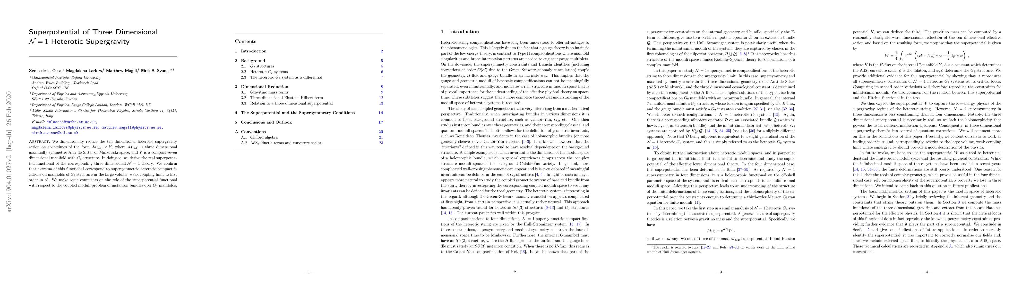We dimensionally reduce the ten dimensional heterotic action on spacetimes of the form ${\cal M}_{(2,1)}\times Y$, where ${\cal M}_{(2,1)}$ is three dimensional maximally symmetric Anti de Sitter or Minkowski space, and $Y$ is a compact seven dimensional manifold with $G_2$ structure. In doing so, we derive the real superpotential functional of the corresponding three dimensional ${\cal N}=1$ theory. We confirm that extrema of this functional precisely correspond to supersymmetric heterotic compactifications on manifolds of $G_2$ structure. We make some comments on the role of the superpotential functional with respect to the coupled moduli problem of instanton bundles over $G_2$ manifolds.