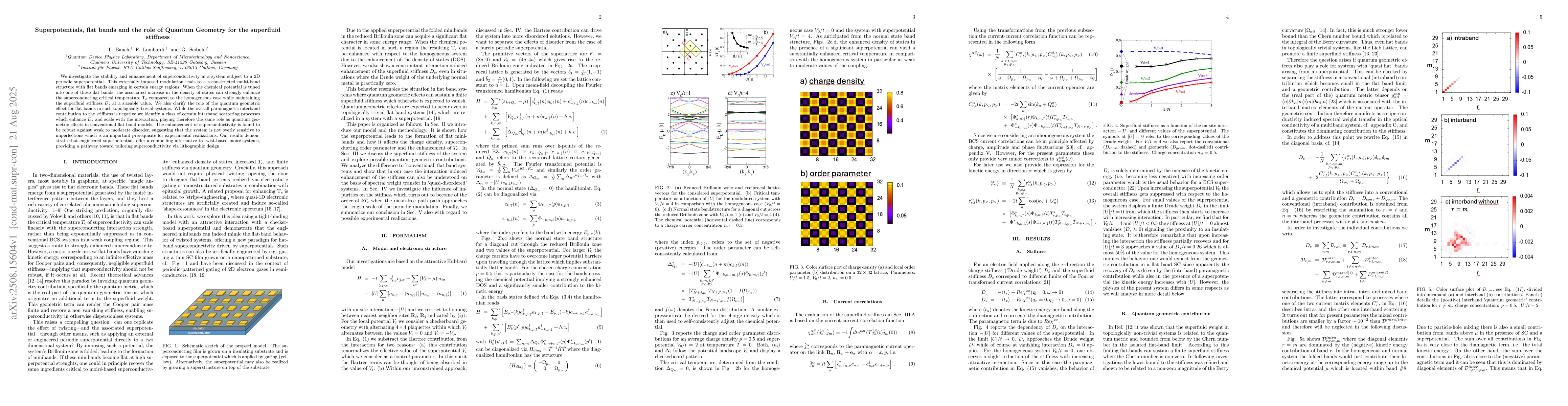 We investigate the stability and enhancement of superconductivity in a system subject to a 2D periodic superpotential. This externally imposed modulation leads to a reconstructed multi-band structure with flat bands emerging in certain energy regions. When the chemical potential is tuned into one of these flat bands, the associated increase in the density of states can strongly enhance the superconducting critical temperature Tc compared to the homogeneous case while maintaining the superfluid stiffness Ds at a sizeable value. We also clarify the role of the quantum geometric effect for flat bands in such topologically trivial systems. While the overall paramagnetic interband contribution to the stiffness is negative we identify a class of certain interband scattering processes which enhance Ds and scale with the interaction, playing therefore the same role as quantum geometric effects in conventional flat band models. The enhancement of superconductivity is found to be robust against weak to moderate disorder, suggesting that the system is not overly sensitive to imperfections which is an important prerequisite for experimental realizations. Our results demonstrate that engineered superpotentials offer a compelling alternative to twist-based moire systems, providing a pathway toward tailoring superconductivity via lithographic design.