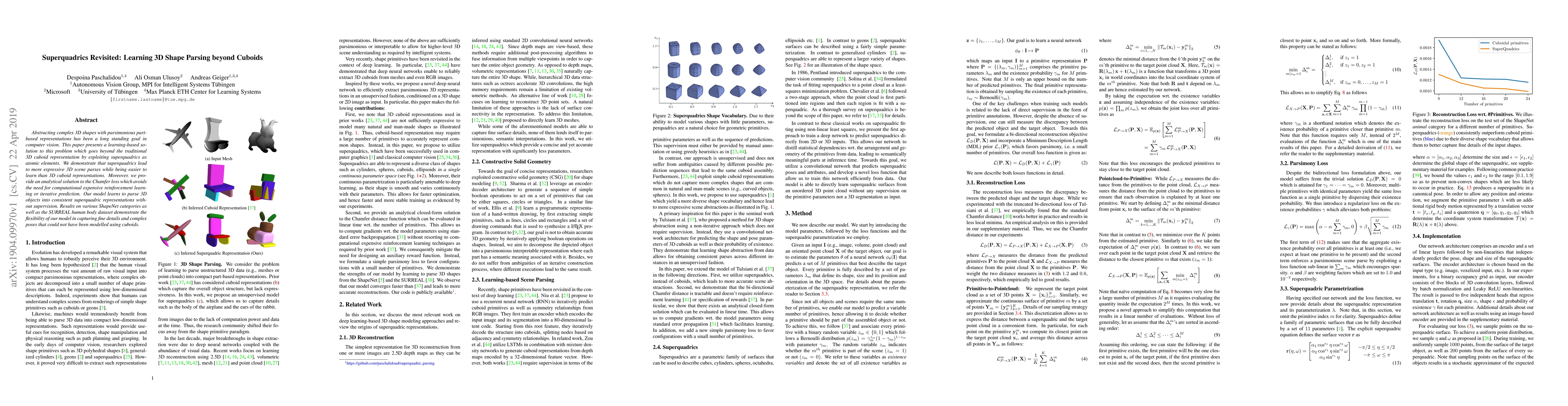 This paper proposes a learning-based approach to 3D shape parsing using superquadrics instead of traditional cuboids, showing improved expressiveness and ease of learning. An analytical solution to the Chamfer loss is presented, enabling effective parsing without costly reinforcement learning, validated across ShapeNet and SURREAL datasets.