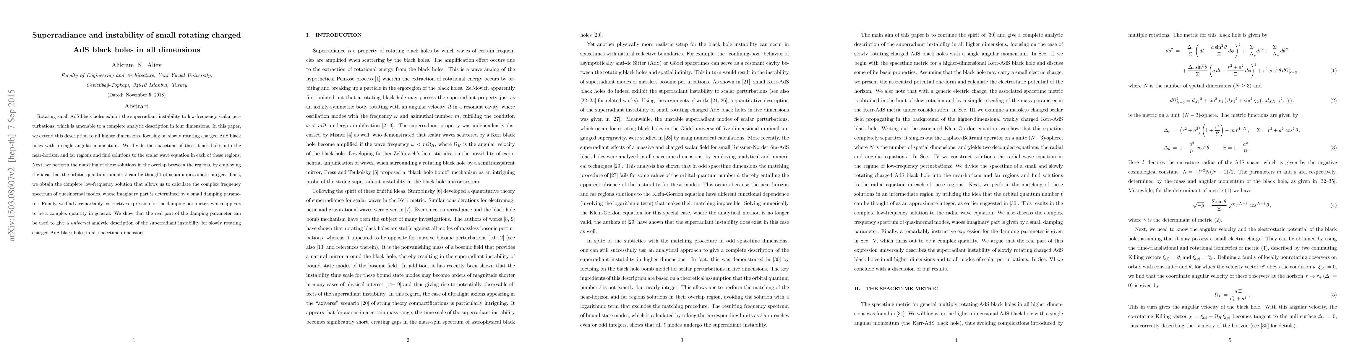 This paper extends the analytic description of superradiant instability in rotating small charged AdS black holes to all dimensions, finding a universal expression for the damping parameter that characterizes the instability, and demonstrating its applicability across different spacetime dimensions.