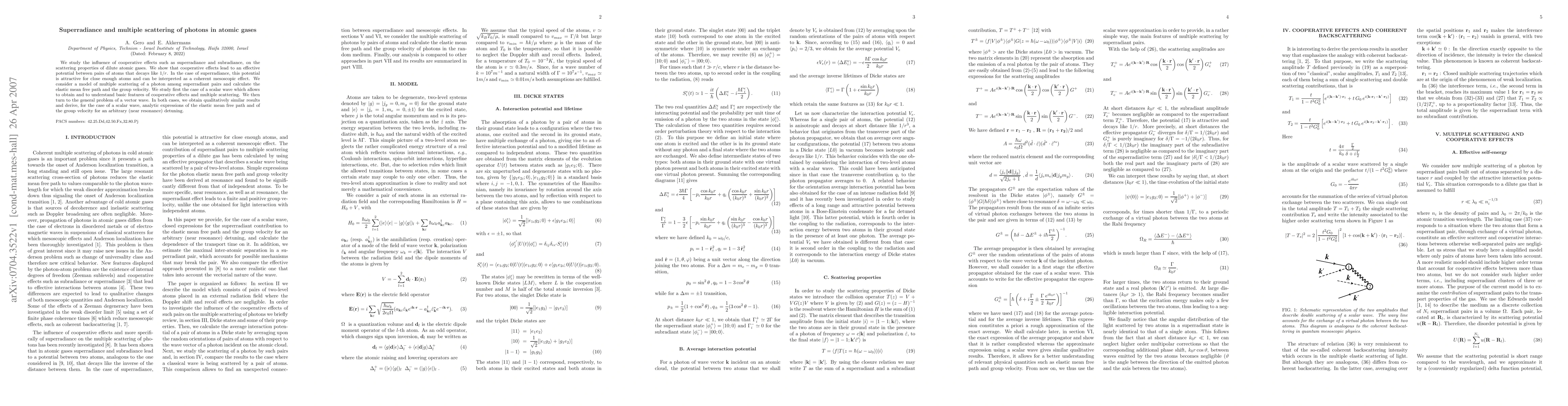 This paper investigates the cooperative effects of superradiance and subradiance in dilute atomic gases, focusing on their impact on photon scattering. It reveals an effective $1/r$ decaying potential between atoms due to these effects, leading to an attractive potential in superradiance scenarios. The study models multiple photon scattering among superradiant pairs, deriving expressions for the elastic mean free path and group velocity, with similar results for both scalar and vector wave cases.
