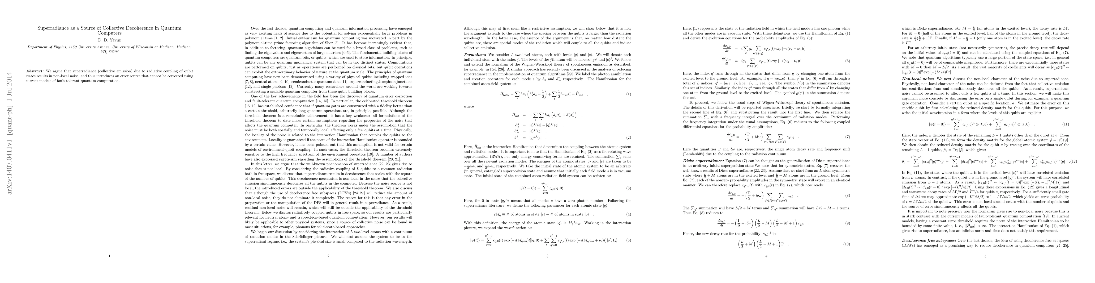 Summary: This paper posits that superradiance in quantum computers leads to collective decoherence through non-local noise, presenting an error source that current fault-tolerant quantum computation models cannot correct.