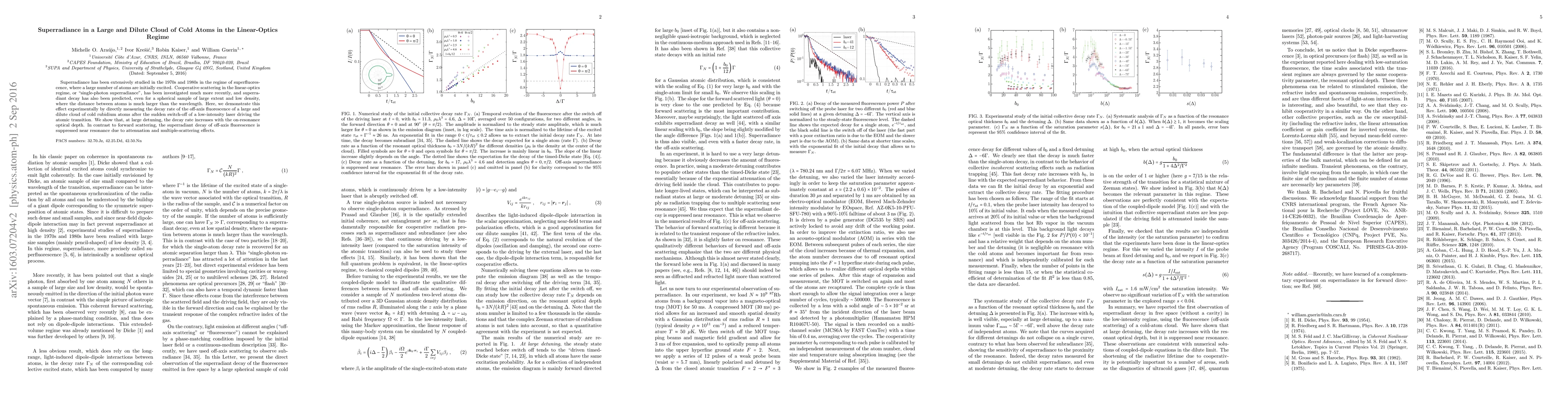 This paper experimentally demonstrates "single-photon superradiance" in a large, dilute cloud of cold rubidium atoms, showing increased decay rate with optical depth at large detuning. Unlike forward scattering, off-axis fluorescence exhibits suppressed superradiant decay near resonance due to attenuation and multiple scattering.