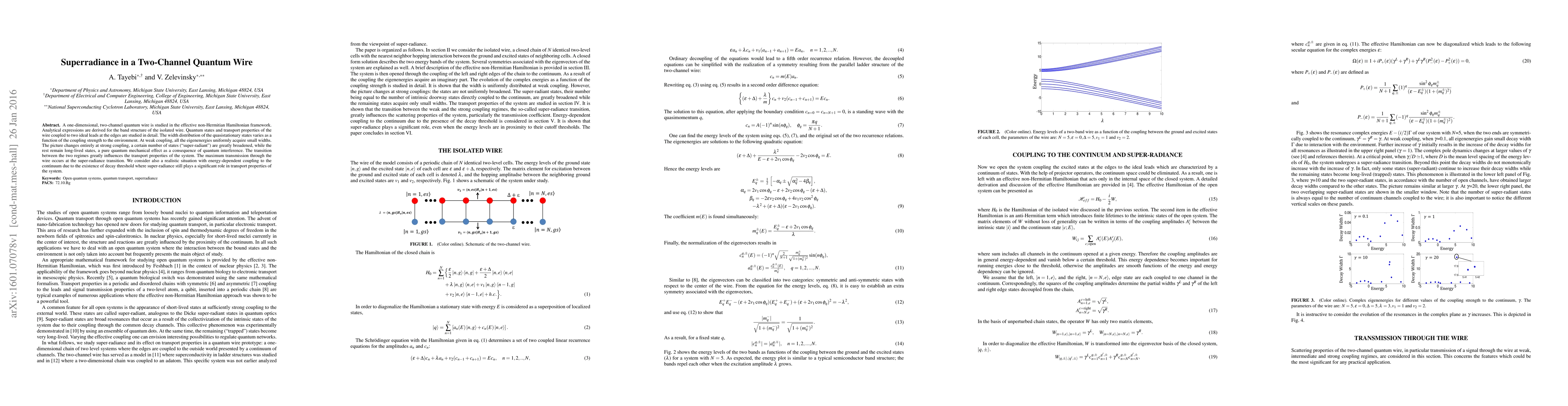 A one-dimensional, two-channel quantum wire is studied in the effective non-Hermitian Hamiltonian framework. Analytical expressions are derived for the band structure of the isolated wire. Quantum states and transport properties of the wire coupled to two ideal leads at the edges are studied in detail. The width distribution of the quasistationary states varies as a function of the coupling strength to the environment. At weak coupling, all the eigenenergies uniformly acquire small widths. The picture changes entirely at strong coupling, a certain number of states ("super-radiant") are greatly broadened, while the rest remain long-lived states, a pure quantum mechanical effect as a consequence of quantum interference. The transition between the two regimes greatly influences the transport properties of the system. The maximum transmission through the wire occurs at the super-radiance transition. We consider also a realistic situation with energy-dependent coupling to the continuum due to the existence of decay threshold where super-radiance still plays a significant role in transport properties of the system.