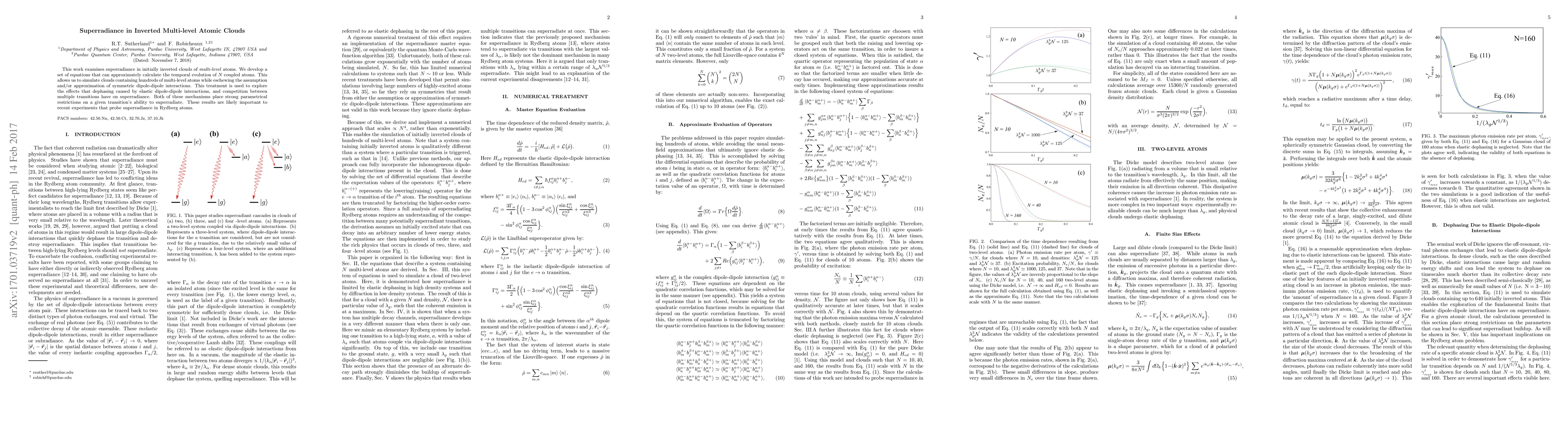 This paper explores superradiance in multi-level atomic clouds with non-symmetric dipole-dipole interactions, developing equations to model the temporal evolution of coupled atoms. It investigates how dephasing and competition between transitions affect superradiance, providing insights relevant to recent Rydberg atom experiments.