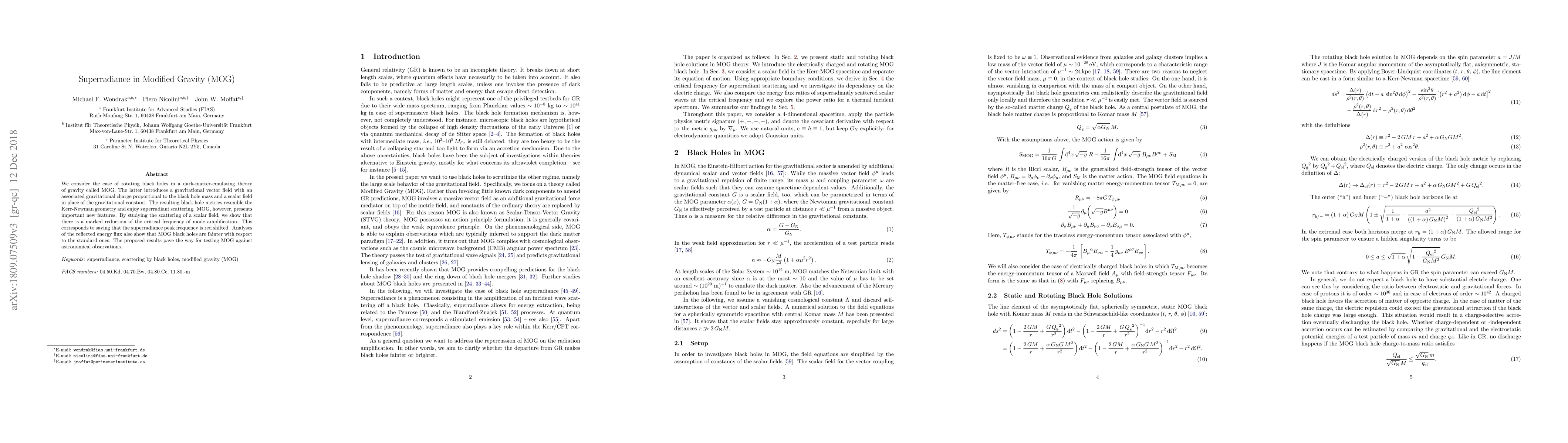 We consider the case of rotating black holes in a dark-matter-emulating theory of gravity called MOG. The latter introduces a gravitational vector field with an associated gravitational charge proportional to the black hole mass and a scalar field in place of the gravitational constant. The resulting black hole metrics resemble the Kerr-Newman geometry and enjoy superradiant scattering. MOG, however, presents important new features. By studying the scattering of a scalar field, we show that there is a marked reduction of the critical frequency of mode amplification. This corresponds to saying that the superradiance peak frequency is red shifted. Analyses of the reflected energy flux also show that MOG black holes are fainter with respect to the standard ones. The proposed results pave the way for testing MOG against astronomical observations.
