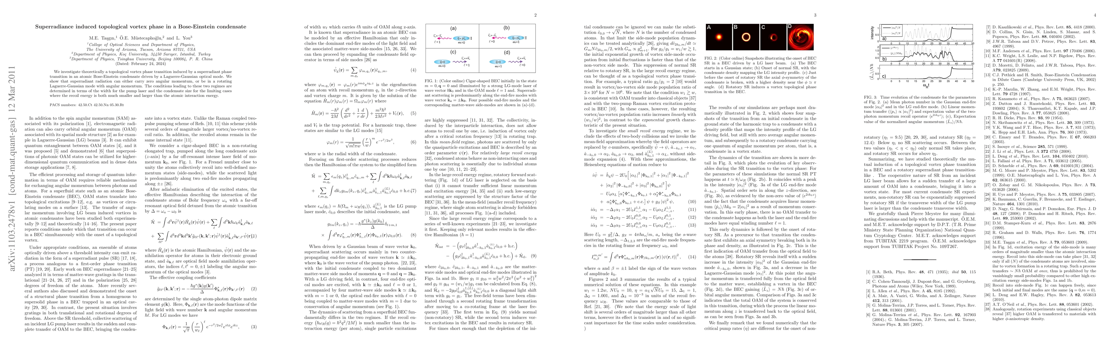 This research explores the induction of a topological vortex phase transition in a Bose-Einstein condensate via a superradiant phase transition driven by a Laguerre-Gaussian optical mode, determining conditions for zero angular momentum superradiant radiation and rotating Laguerre-Gaussian modes with angular momentum.