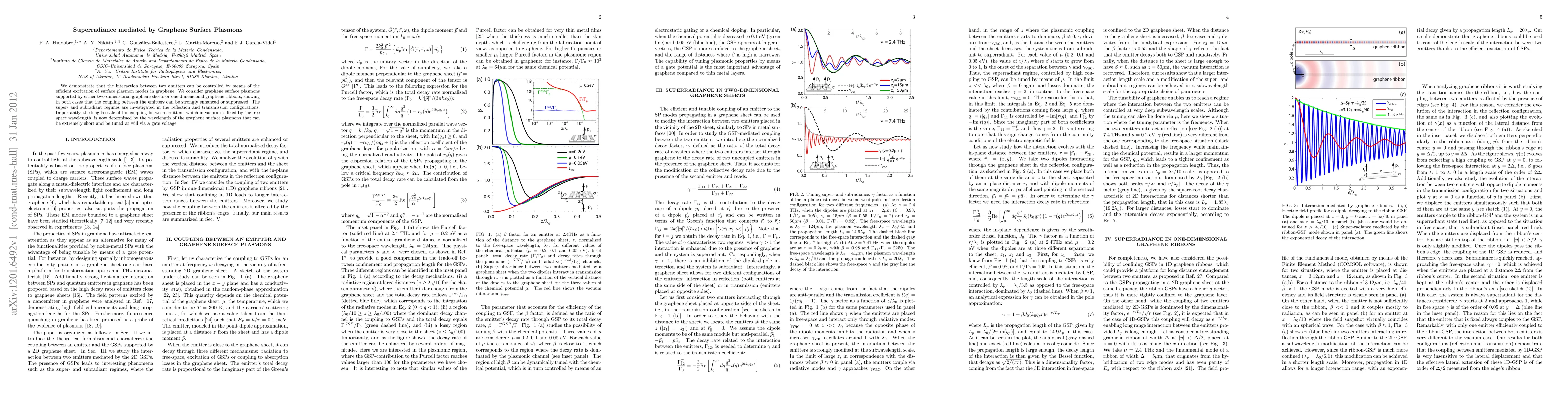 We demonstrate that the interaction between two emitters can be controlled by means of the efficient excitation of surface plasmon modes in graphene. We consider graphene surface plasmons supported by either two-dimensional graphene sheets or one-dimensional graphene ribbons, showing in both cases that the coupling between the emitters can be strongly enhanced or suppressed. The super- and subradiant regimes are investigated in the reflection and transmission configurations. Importantly, the length scale of the coupling between emitters, which in vacuum is fixed by the free space wavelength, is now determined by the wavelength of the graphene surface plasmons that can be extremely short and be tuned at will via a gate voltage.