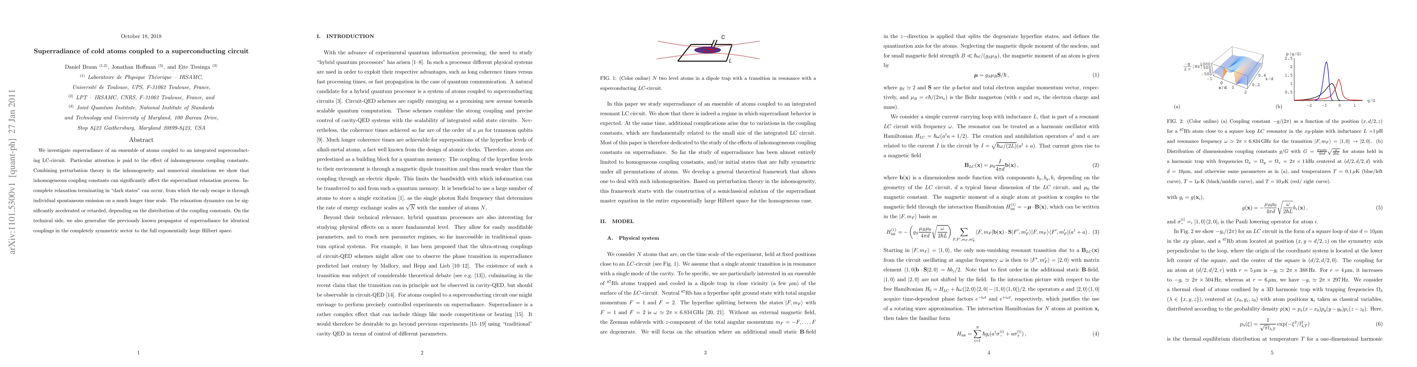 This paper explores superradiance in cold atoms linked to a superconducting LC-circuit, focusing on the impact of inhomogeneous coupling constants. The study reveals that these variations can lead to incomplete relaxation and "dark states," with dynamics that can be accelerated or delayed based on the coupling distribution.