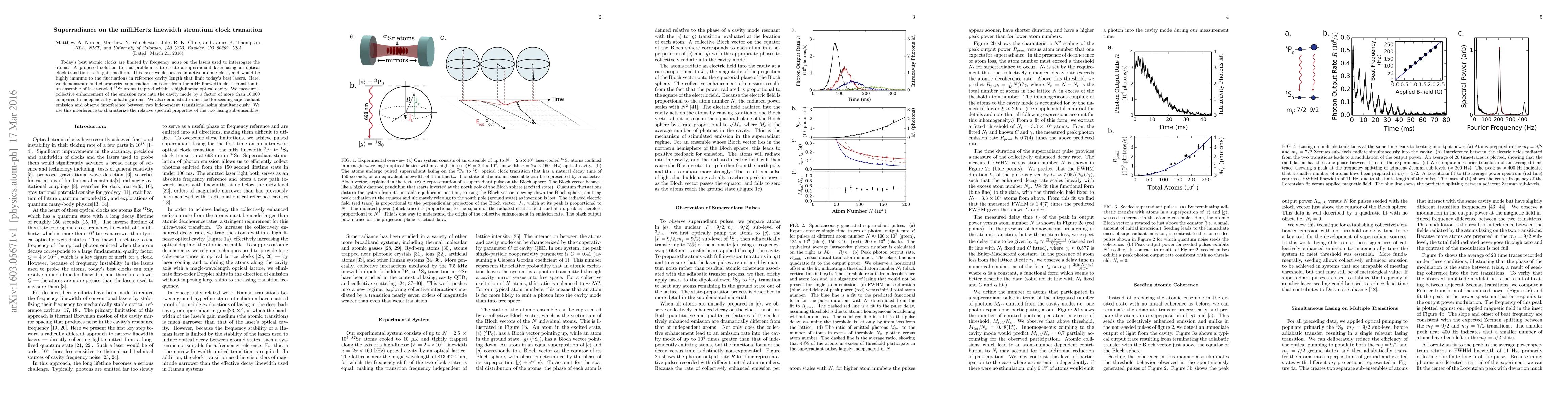 This paper demonstrates superradiant emission from a strontium atomic clock transition, achieving a collective enhancement of emission rate by over 10,000 times. The study also explores seeding techniques and interference between simultaneous transitions to characterize the spectral properties.