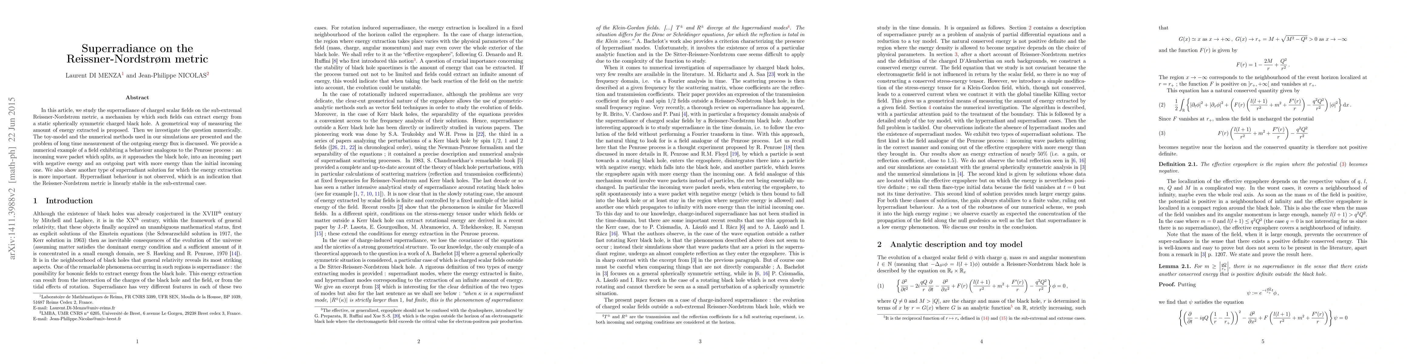 This paper investigates superradiance of charged scalar fields on the sub-extremal Reissner-Nordstrom black hole, proposing a method to measure energy extraction. Numerical simulations reveal a field behavior similar to the Penrose process, with significant energy extraction but no hyperradiant behavior, indicating linear stability.