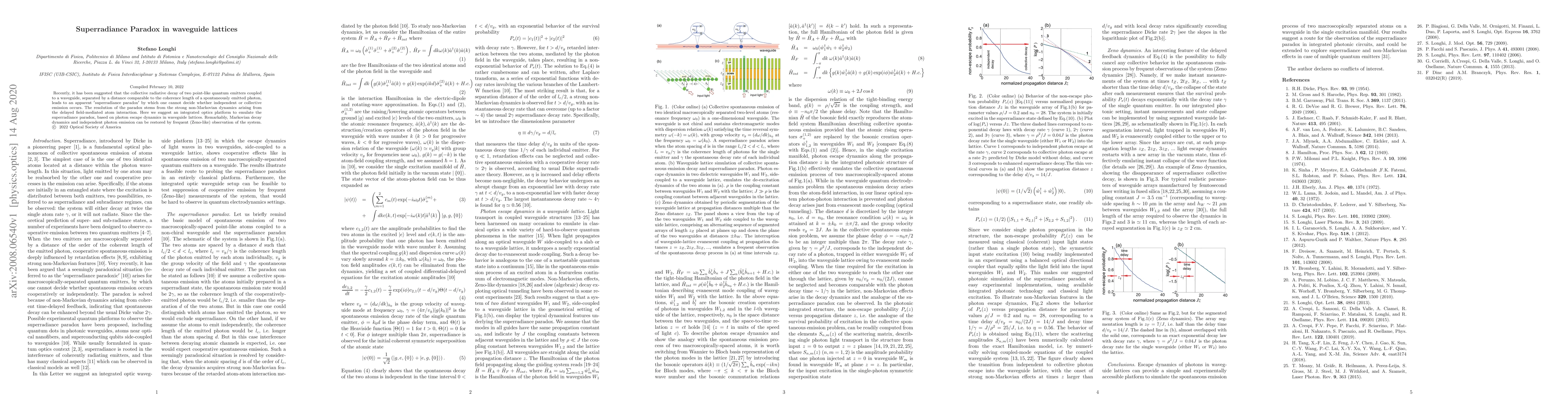The paper explores the "superradiance paradox" in waveguide lattices where quantum emitters exhibit non-Markovian dynamics, leading to uncertainty in independent versus collective emission. The study proposes an integrated optics platform to emulate this phenomenon and suggests that frequent observations can restore Markovian decay dynamics.
