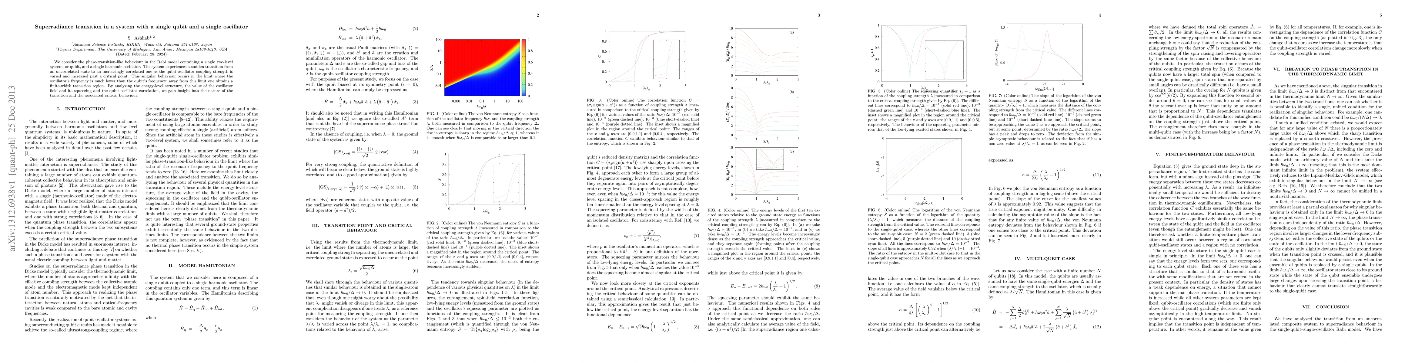 This paper investigates the superradiance transition in the Rabi model with a single qubit and oscillator, revealing a sudden shift from uncorrelated to highly correlated states past a critical coupling strength. The transition is singular when the oscillator's frequency is much lower than the qubit's, but becomes a finite-width region otherwise.