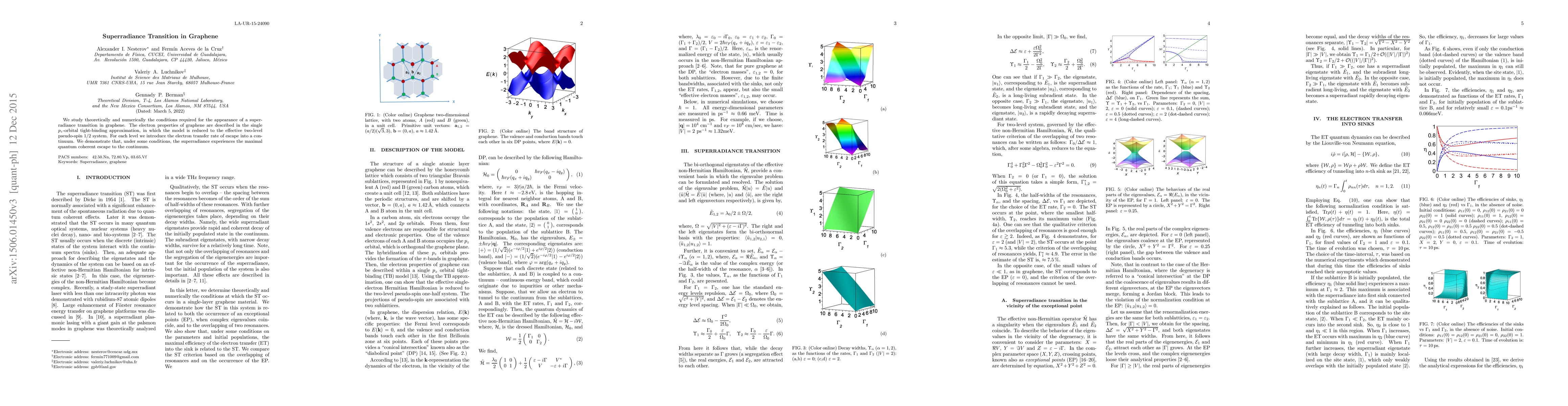 We study theoretically and numerically the conditions required for the appearance of a superradiance transition in graphene. The electron properties of graphene are described in the single $p_z$-orbital tight-binding approximation, in which the model is reduced to the effective two-level pseudo-spin $1/2$ system. For each level we introduce the electron transfer rate of escape into a continuum. We demonstrate that, under some conditions, the superradiance experiences the maximal quantum coherent escape to the continuum.