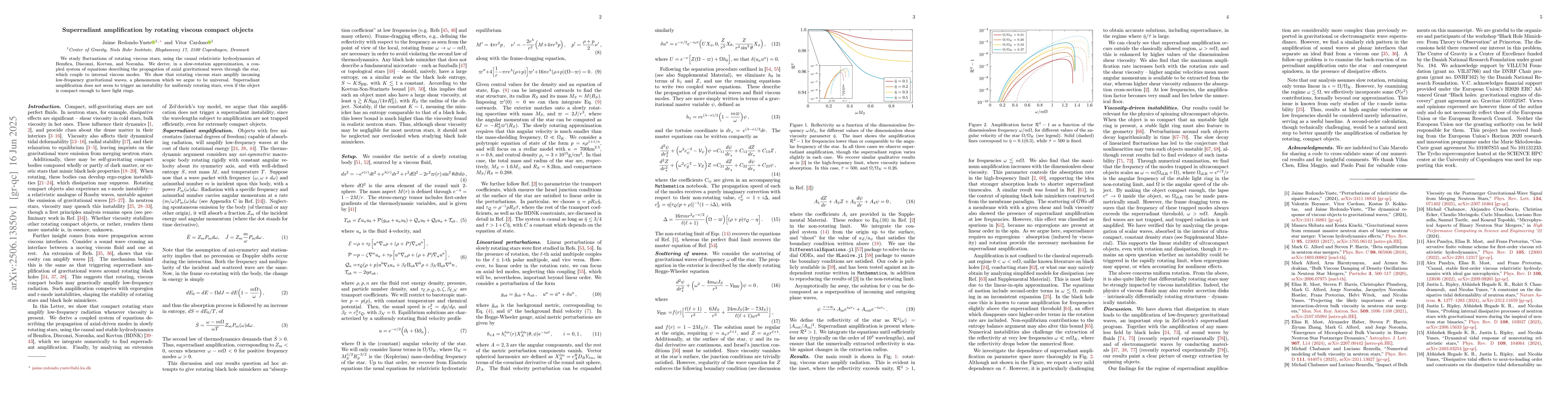 We study fluctuations of rotating viscous stars, using the causal relativistic hydrodynamics of Bemfica, Disconzi, Kovtun, and Noronha. We derive, in a slow-rotation approximation, a coupled system of equations describing the propagation of axial gravitational waves through the star, which couple to internal viscous modes. We show that rotating viscous stars amplify incoming low-frequency gravitational waves, a phenomenon which we argue to be universal. Superradiant amplification does not seem to trigger an instability for uniformly rotating stars, even if the object is compact enough to have light rings.