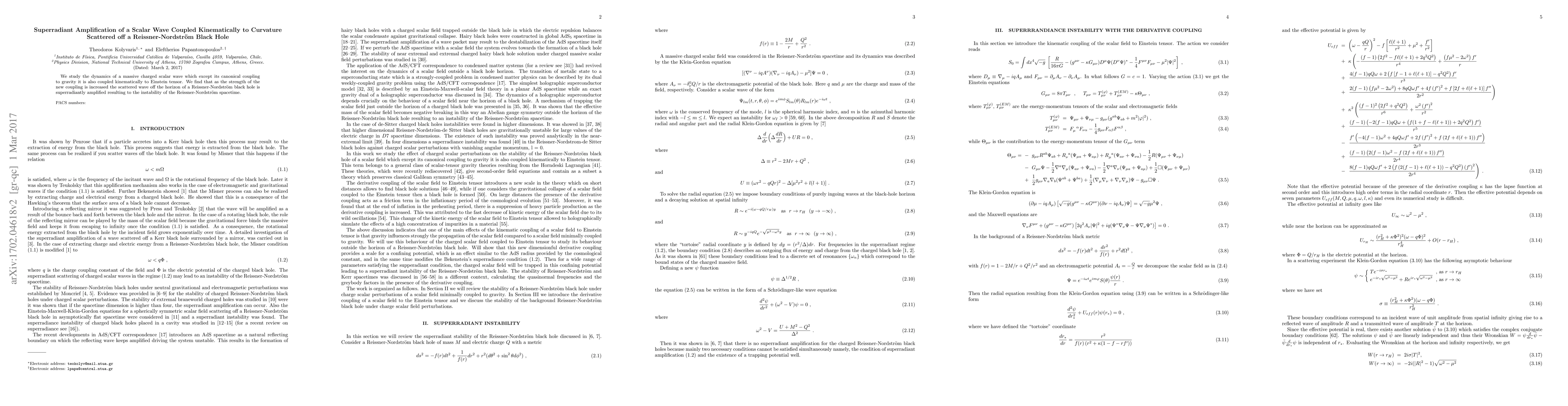 We study the dynamics of a massive charged scalar wave which except its canonical coupling to gravity it is also coupled kinematically to Einstein tensor. We find that as the strength of the new coupling is increased the scattered wave off the horizon of a Reissner-Nordstr\"om black hole is superradiantly amplified resulting to the instability of the Reissner-Nordstr\"om spacetime.