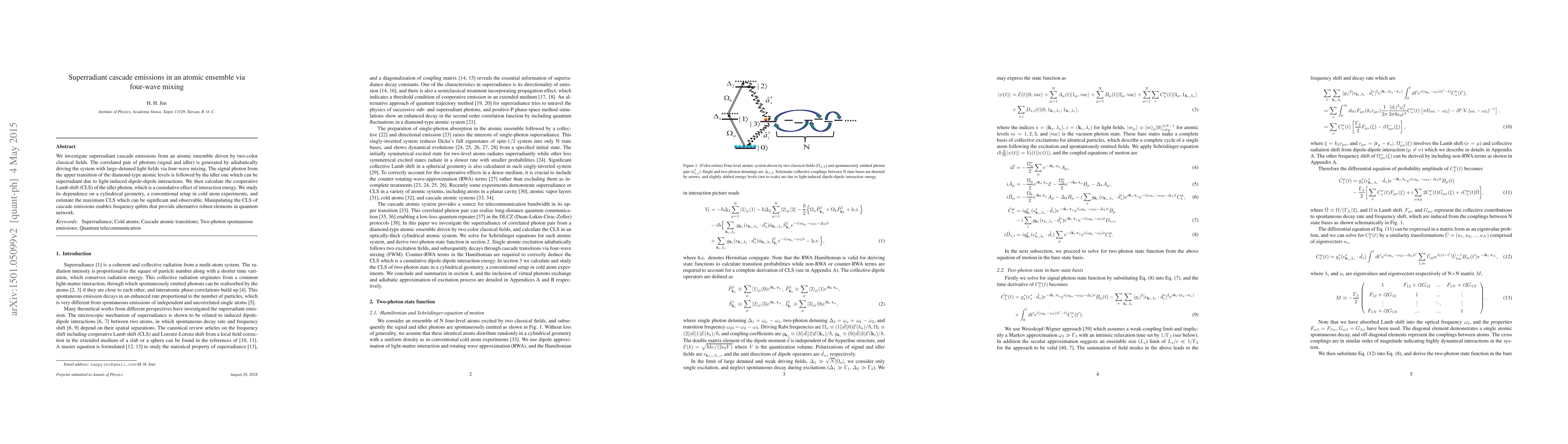 This paper explores superradiant cascade emissions in an atomic ensemble driven by two-color classical fields, generating correlated photon pairs via four-wave mixing. It calculates the cooperative Lamb shift of the idler photon, emphasizing its dependence on cylindrical geometry and potential for significant observable effects, which could enhance frequency qubits in quantum networks.