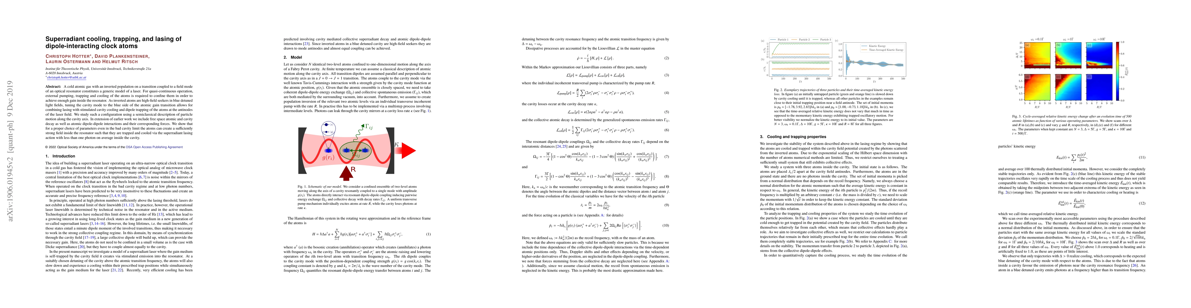 This paper investigates a system of dipole-interacting clock atoms within an optical resonator, demonstrating how superradiant cooling, trapping, and lasing can be achieved through blue detuned light fields. The study incorporates atomic decay, dipole-dipole interactions, and shows that under specific conditions, atoms can be cooled and trapped via superradiant lasing with minimal cavity photons.