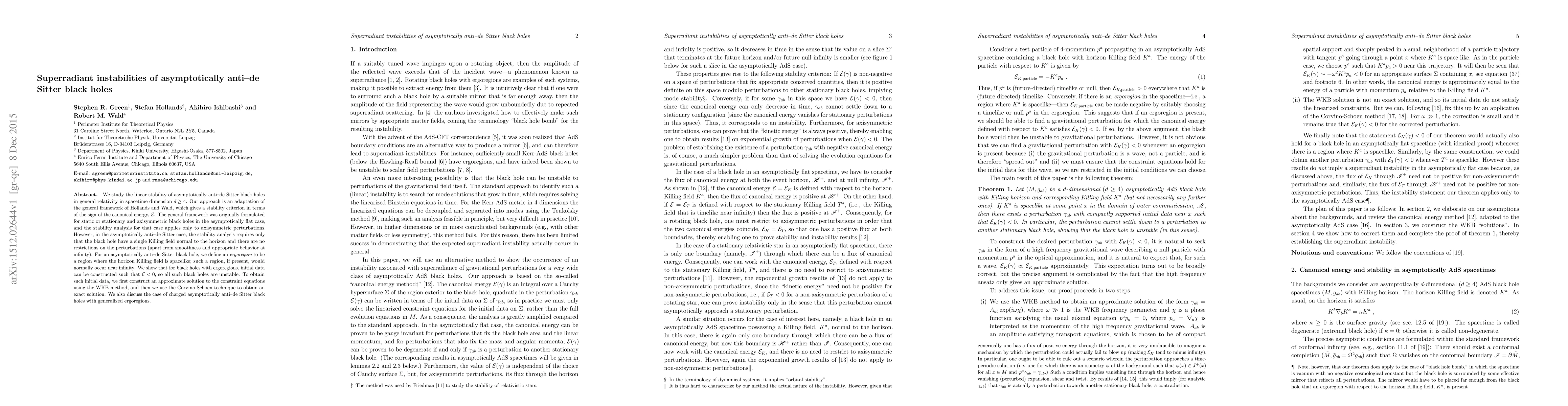 This paper investigates the linear stability of asymptotically anti-de Sitter black holes in general relativity, adapting the Hollands-Wald framework. It demonstrates that black holes with ergoregions are inherently unstable due to the possibility of negative canonical energy, $\mathcal{E}<0$, using WKB and Corvino-Schoen techniques for constructing initial data.