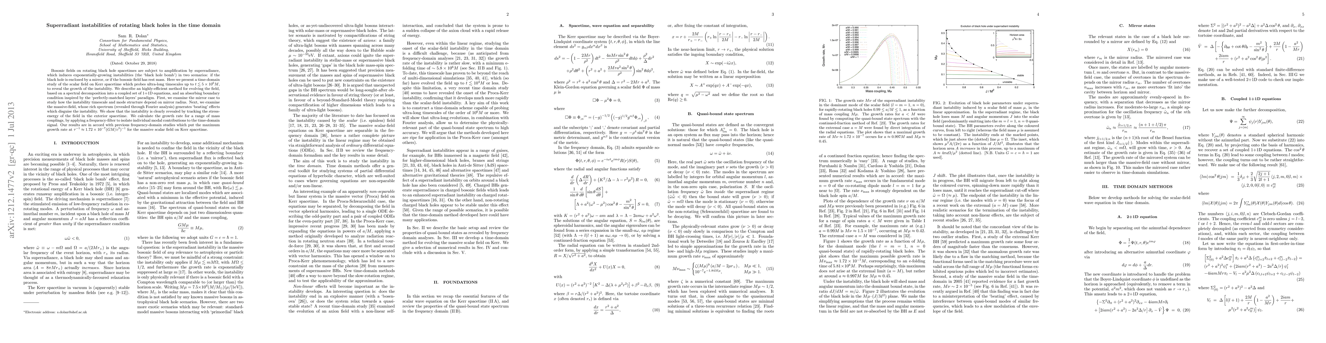 Bosonic fields on rotating black hole spacetimes are subject to amplification by superradiance, which induces exponentially-growing instabilities (the `black hole bomb') in two scenarios: if the black hole is enclosed by a mirror, or if the bosonic field has rest mass. Here we present a time-domain study of the scalar field on Kerr spacetime which probes ultra-long timescales up to $t \lesssim 5 \times 10^6 M$, to reveal the growth of the instability. We describe an highly-efficient method for evolving the field, based on a spectral decomposition into a coupled set of 1+1D equations, and an absorbing boundary condition inspired by the `perfectly-matched layers' paradigm. First, we examine the mirror case to study how the instability timescale and mode structure depend on mirror radius. Next, we examine the massive-field, whose rich spectrum (revealed through Fourier analysis) generates `beating' effects which disguise the instability. We show that the instability is clearly revealed by tracking the stress-energy of the field in the exterior spacetime. We calculate the growth rate for a range of mass couplings, by applying a frequency-filer to isolate individual modal contributions to the time-domain signal. Our results are in accord with previous frequency-domain studies which put the maximum growth rate at $\tau^{-1} \approx 1.72 \times 10^{-7} (GM/c^3)^{-1}$ for the massive scalar field on Kerr spacetime.