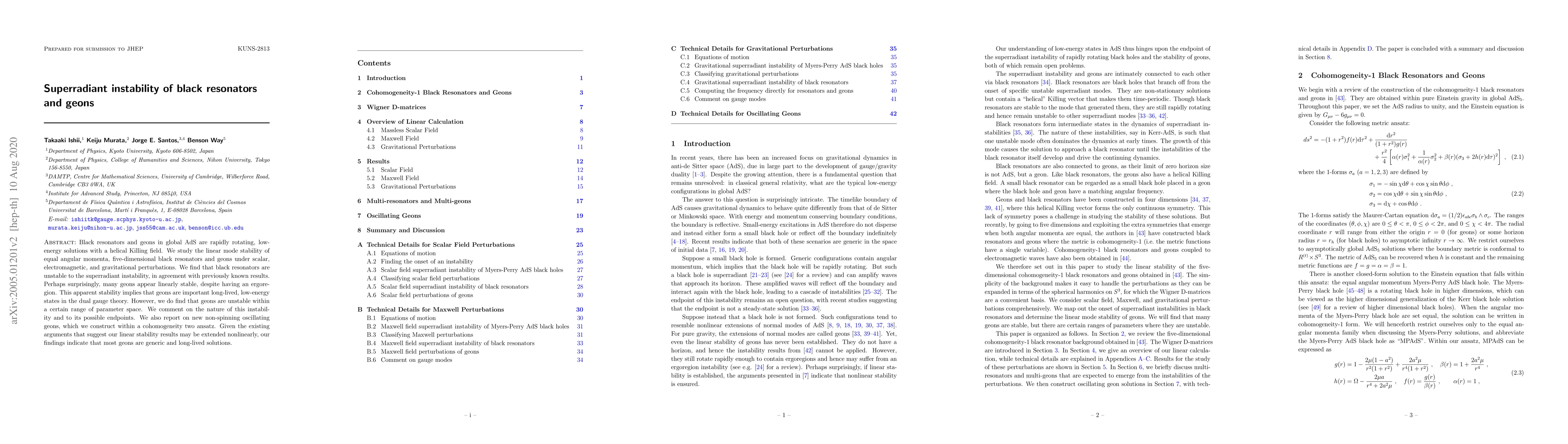 This paper investigates the linear mode stability of five-dimensional black resonators and geons in global AdS, finding that black resonators exhibit superradiant instability while many geons remain stable, though some are unstable within specific parameter ranges. The study suggests that geons are significant long-lived states in the dual gauge theory.
