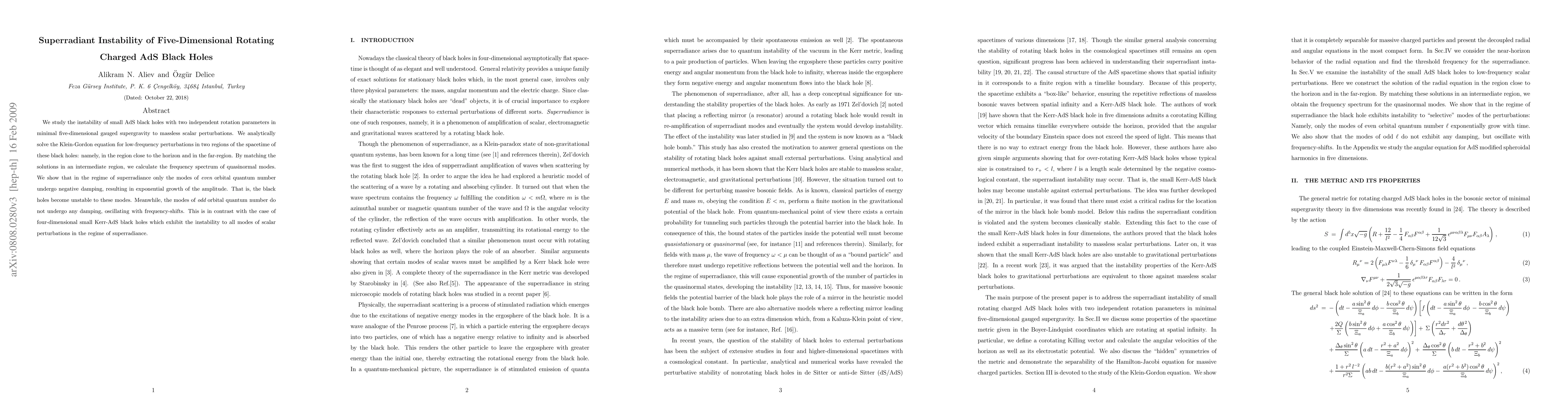 We study the instability of small AdS black holes with two independent rotation parameters in minimal five-dimensional gauged supergravity to massless scalar perturbations. We analytically solve the Klein-Gordon equation for low-frequency perturbations in two regions of the spacetime of these black holes: namely, in the region close to the horizon and in the far-region. By matching the solutions in an intermediate region, we calculate the frequency spectrum of quasinormal modes. We show that in the regime of superradiance only the modes of even orbital quantum number undergo negative damping, resulting in exponential growth of the amplitude. That is, the black holes become unstable to these modes. Meanwhile, the modes of odd orbital quantum number do not undergo any damping, oscillating with frequency-shifts. This is in contrast with the case of four-dimensional small Kerr-AdS black holes which exhibit the instability to all modes of scalar perturbations in the regime of superradiance.