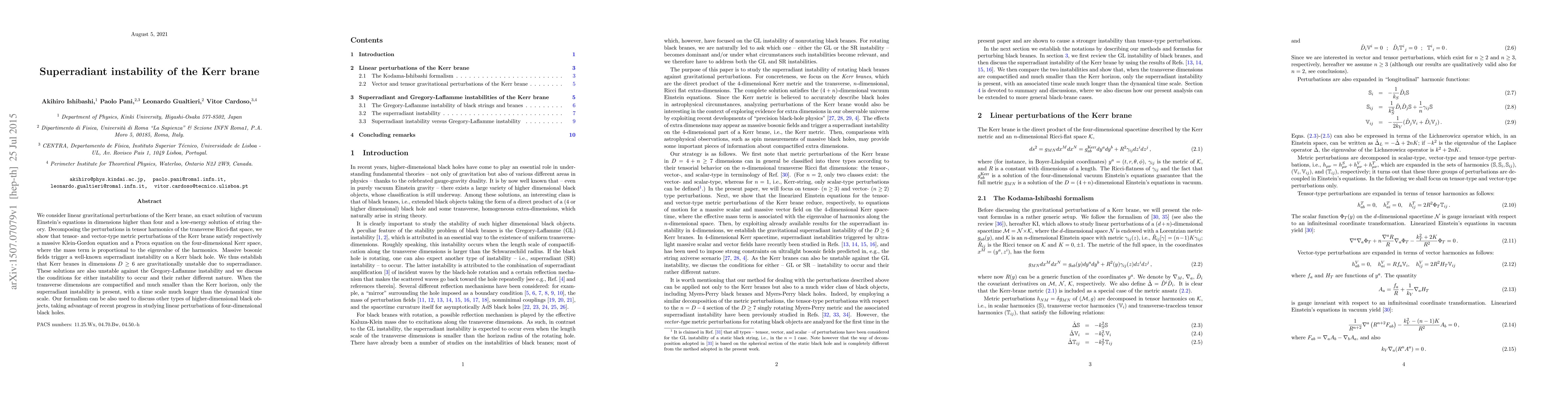 This paper investigates the gravitational stability of Kerr branes, higher-dimensional solutions of vacuum Einstein's equations, showing they exhibit superradiant instability due to massive bosonic fields. It also discusses the Gregory-Laflamme instability and compares the nature of these instabilities in the context of compactified transverse dimensions.