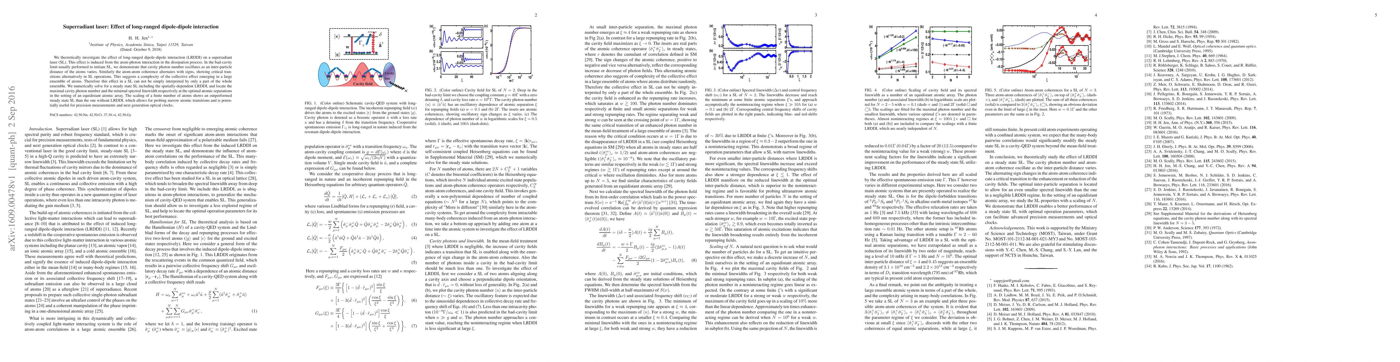 The paper presents a detailed theoretical analysis of LRDDI effects on superradiant lasers, including the derivation of Heisenberg equations of motion and numerical solutions for steady-state properties.