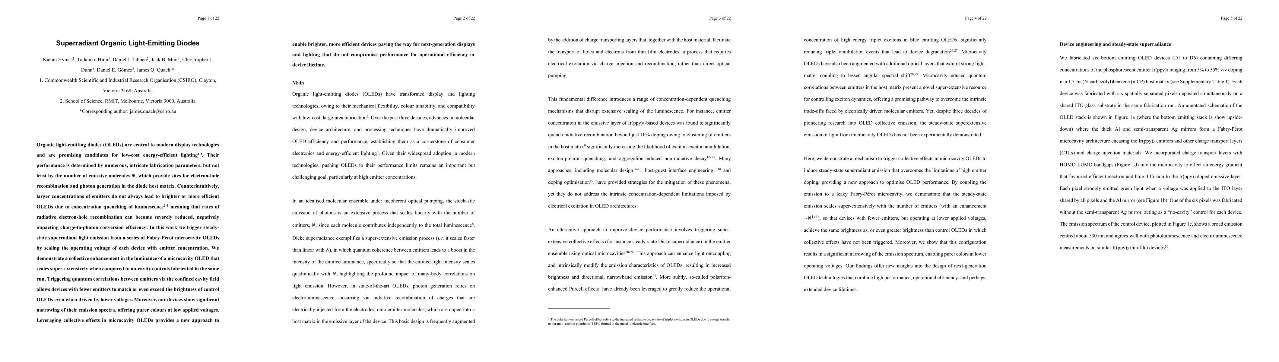 Organic light-emitting diodes (OLEDs) are central to modern display technologies and are promising candidates for low-cost energy-efficient lighting. Their performance is determined by numerous, intricate fabrication parameters, but not least by the number of emissive molecules N, which provide sites for electron-hole recombination and photon generation in the diode host matrix. Counterintuitively, larger concentrations of emitters do not always lead to brighter or more efficient OLEDs due to concentration quenching of luminescence meaning that rates of radiative electron-hole recombination can become severely reduced, negatively impacting charge-to-photon conversion efficiency. In this work we trigger steady-state superradiant light emission from a series of Fabry-P\'erot microcavity OLEDs by scaling the operating voltage of each device with emitter concentration. We demonstrate a collective enhancement in the luminance of a microcavity OLED that scales super-extensively when compared to no-cavity controls fabricated in the same run. Triggering quantum correlations between emitters via the confined cavity field allows devices with fewer emitters to match or even exceed the brightness of control OLEDs even when driven by lower voltages. Moreover, our devices show significant narrowing of their emission spectra, offering purer colours at low applied voltages. Leveraging collective effects in microcavity OLEDs provides a new approach to enable brighter, more efficient devices paving the way for next-generation displays and lighting that do not compromise performance for operational efficiency or device lifetime.