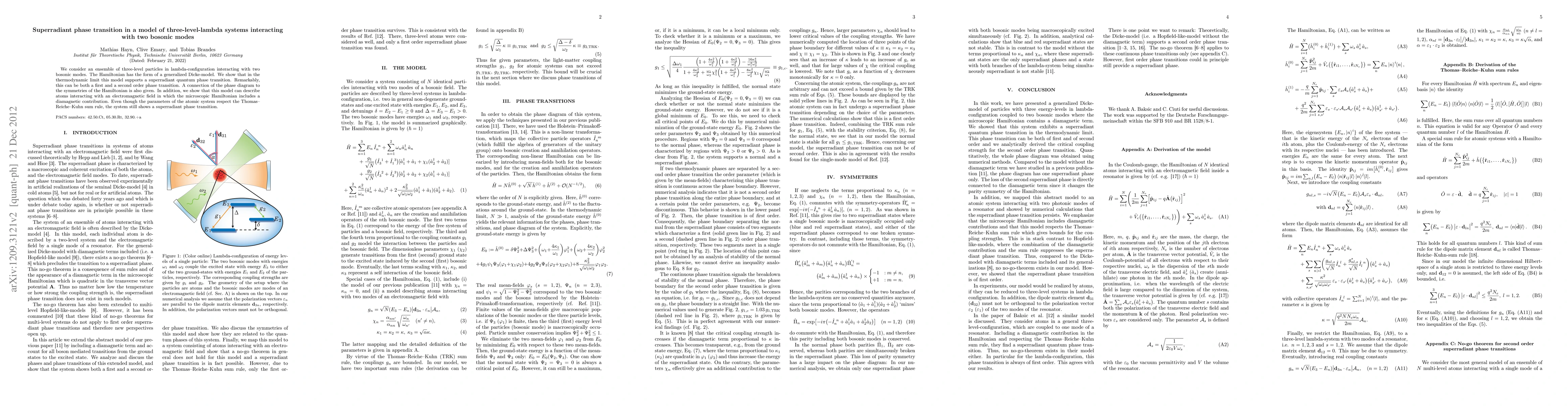 We consider an ensemble of three-level particles in lambda-configuration interacting with two bosonic modes. The Hamiltonian has the form of a generalized Dicke-model. We show that in the thermodynamic limit this model supports a superradiant quantum phase transition. Remarkably, this can be both a first and a second order phase transition. A connection of the phase diagram to the symmetries of the Hamiltonian is also given. In addition, we show that this model can describe atoms interacting with an electromagnetic field in which the microscopic Hamiltonian includes a diamagnetic contribution. Even though the parameters of the atomic system respect the Thomas--Reiche--Kuhn sum rule, the system still shows a superradiant phase transition.
