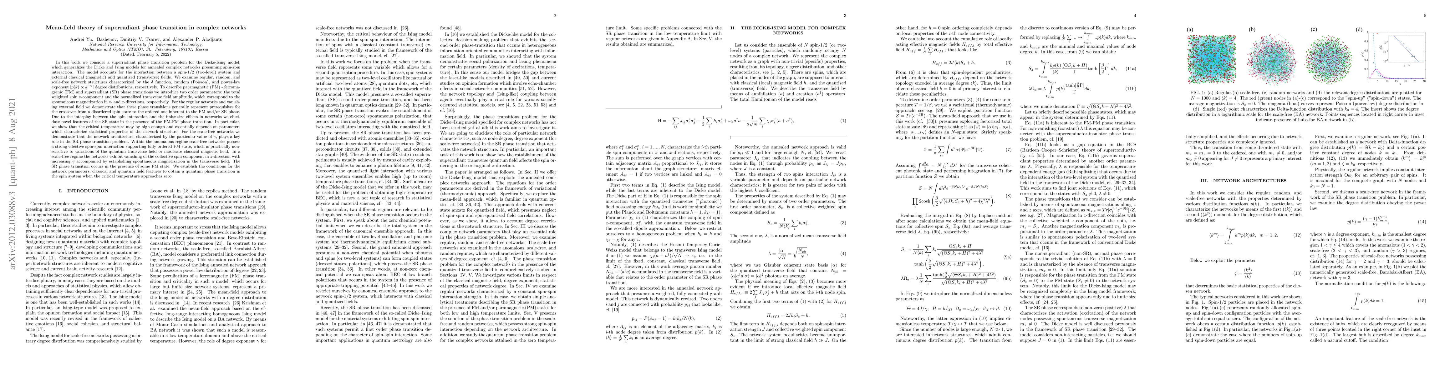 This paper investigates the superradiant phase transition in the Dicke-Ising model across various complex network structures, including regular, random, and scale-free networks. The study reveals that the critical temperature for the superradiant phase transition increases with the network's degree exponent, leading to spontaneous magnetization and a vanishing collective spin component, and identifies conditions for quantum phase transitions as the critical temperature approaches zero.