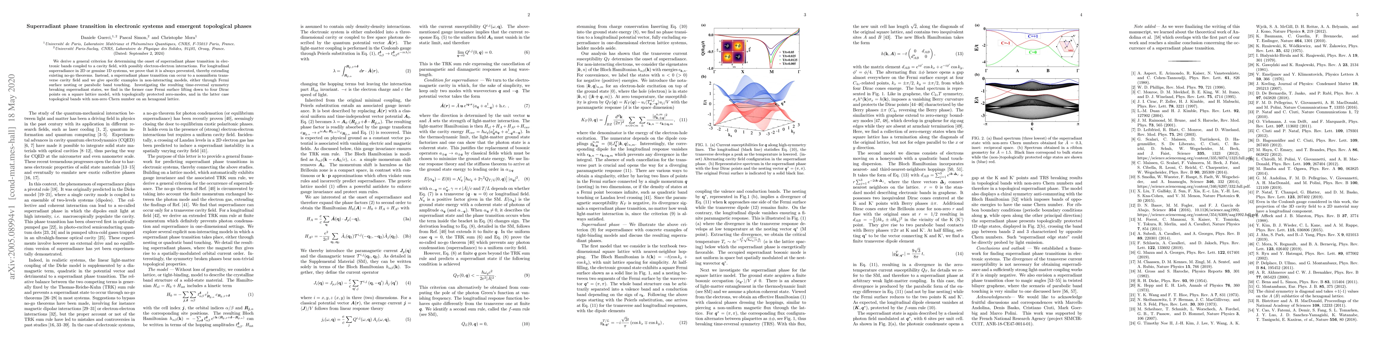 We derive a general criterion for determining the onset of superradiant phase transition in electronic bands coupled to a cavity field, with possibly electron-electron interactions. For longitudinal superradiance in 2D or genuine 1D systems, we prove that it is always prevented, thereby extending existing no-go theorems. Instead, a superradiant phase transition can occur to a nonuniform transverse cavity field and we give specific examples in non-interacting models, either through Fermi surface nesting or parabolic band touching. Investigating the resulting time-reversal symmetry breaking superradiant states, we find in the former case Fermi surface lifting down to four Dirac points on a square lattice model, with topologically protected zero-modes, and in the latter case topological bands with non-zero Chern number on an hexagonal lattice.