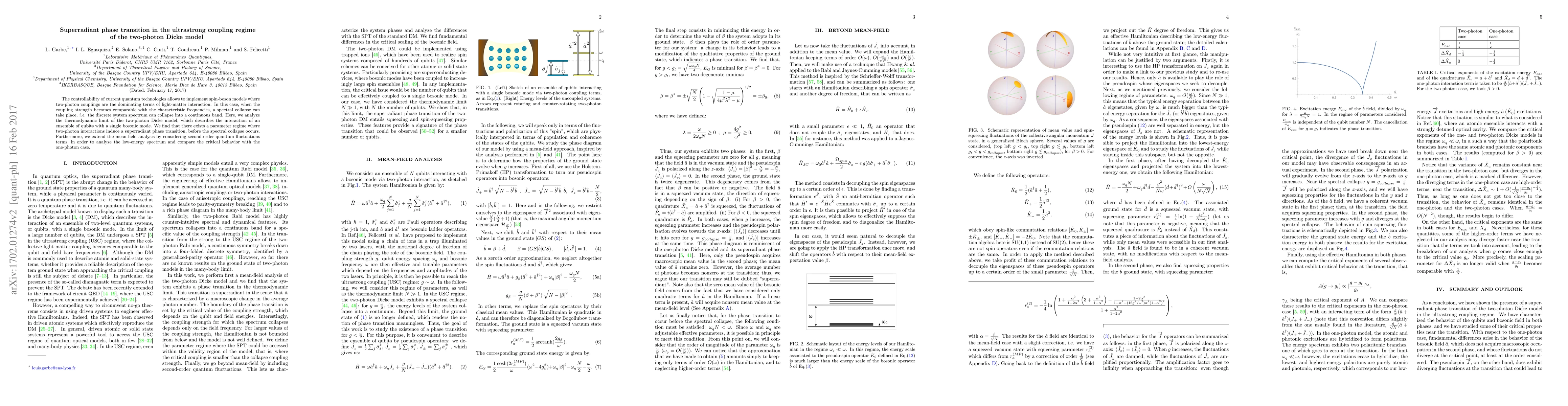 The controllability of current quantum technologies allows to implement spin-boson models where two-photon couplings are the dominating terms of light-matter interaction. In this case, when the coupling strength becomes comparable with the characteristic frequencies, a spectral collapse can take place, i.e. the discrete system spectrum can collapse into a continuous band. Here, we analyze the thermodynamic limit of the two-photon Dicke model, which describes the interaction of an ensemble of qubits with a single bosonic mode. We find that there exists a parameter regime where two-photon interactions induce a superradiant phase transition, before the spectral collapse occurs. Furthermore, we extend the mean-field analysis by considering second-order quantum fluctuations terms, in order to analyze the low-energy spectrum and compare the critical behavior with the one-photon case.