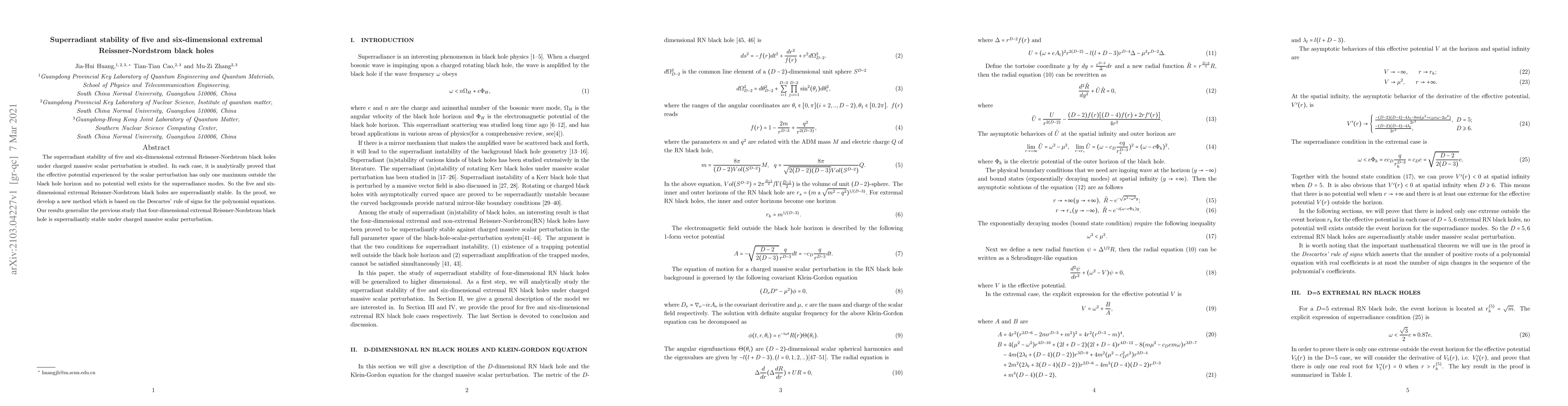 Summary: The research proves that five and six-dimensional extremal Reissner-Nordstrom black holes are superradiantly stable against charged massive scalar perturbations, as the effective potential lacks a potential well, employing a novel analytical method based on Descartes' rule of signs. This result extends the stability findings from four dimensions.