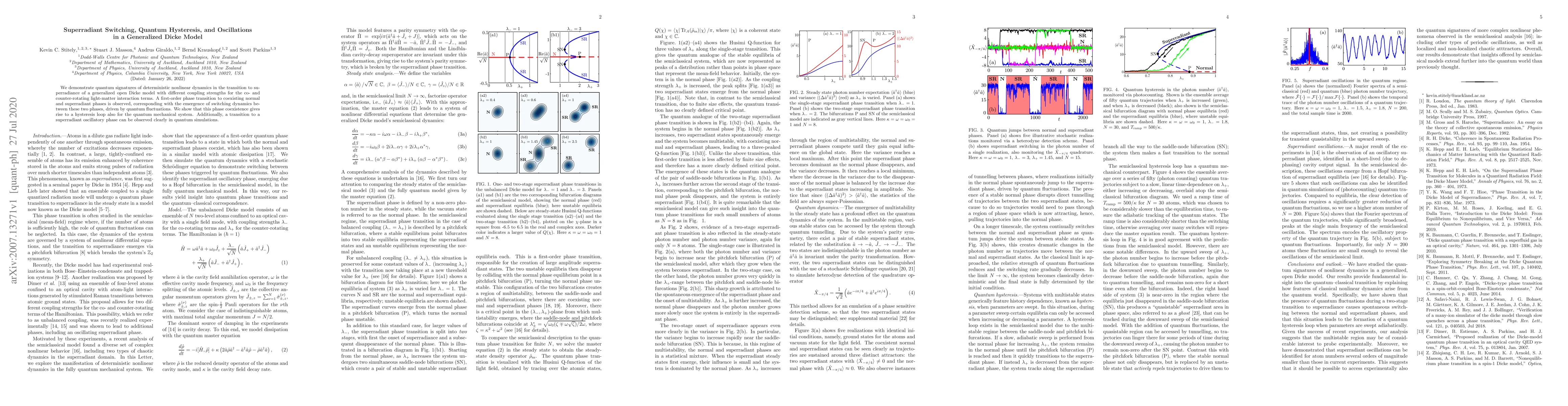 This paper investigates the generalized Dicke model, revealing quantum signatures of nonlinear dynamics during the transition to superradiance. It observes a first-order phase transition with quantum hysteresis and switching dynamics driven by quantum fluctuations, alongside the emergence of superradiant oscillations.