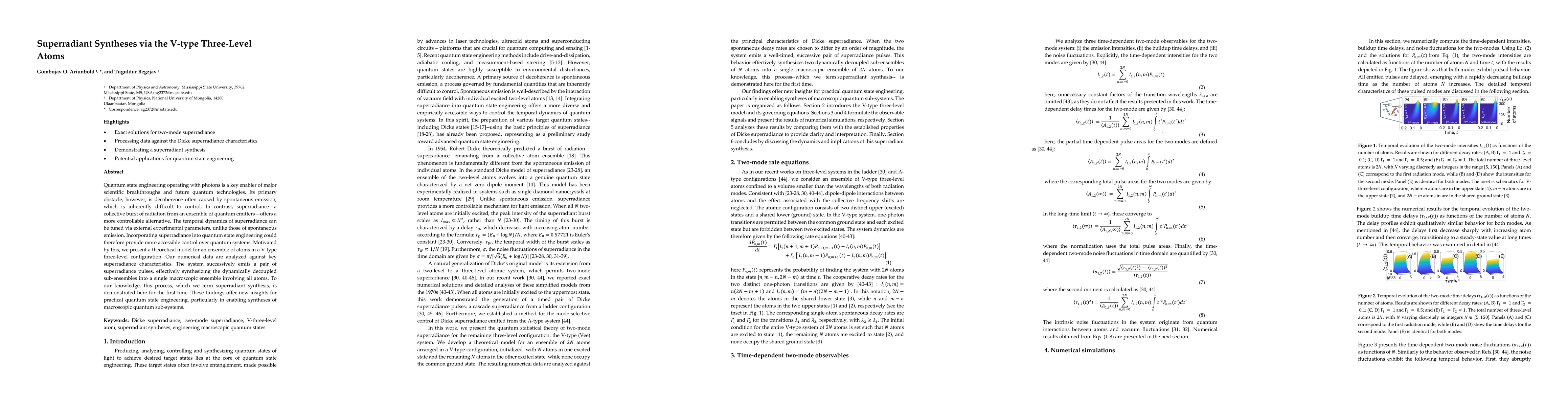 Quantum state engineering operating with photons is a key enabler of major scientific breakthroughs and future quantum technologies. Its primary obstacle, however, is decoherence often caused by spontaneous emission, which is inherently difficult to control. In contrast, superradiance offers a more controllable alternative. The temporal dynamics of superradiance can be tuned via external experimental parameters, unlike those of spontaneous emission. Incorporating superradiance into quantum state engineering could therefore provide more accessible control over quantum systems. Motivated by this, we present a theoretical model for an ensemble of atoms in a V - type three - level configuration. Our numerical data are analyzed against key superradiance characteristics. The system successively emits a pair of superradiance pulses, effectively synthesizing the dynamically decoupled sub - ensembles into a single macroscopic ensemble involving all atoms. To our knowledge, this process, which we term superradiant synthesis, is demonstrated here for the first time. These findings offer new insights for practical quantum state engineering, particularly in enabling syntheses of macroscopic quantum sub-systems.