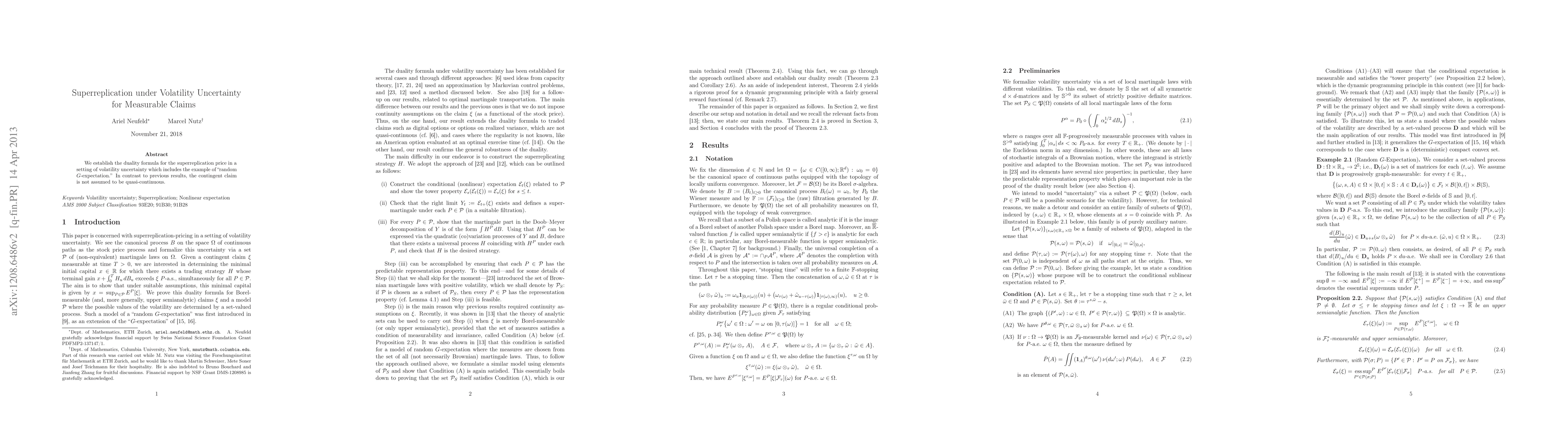 Summary: This paper presents a duality-formula for the superreplication price under volatility uncertainty, introducing the concept of "random G-expectation" and allowing for measurable claims without the quasi-continuity assumption, differing from prior studies.