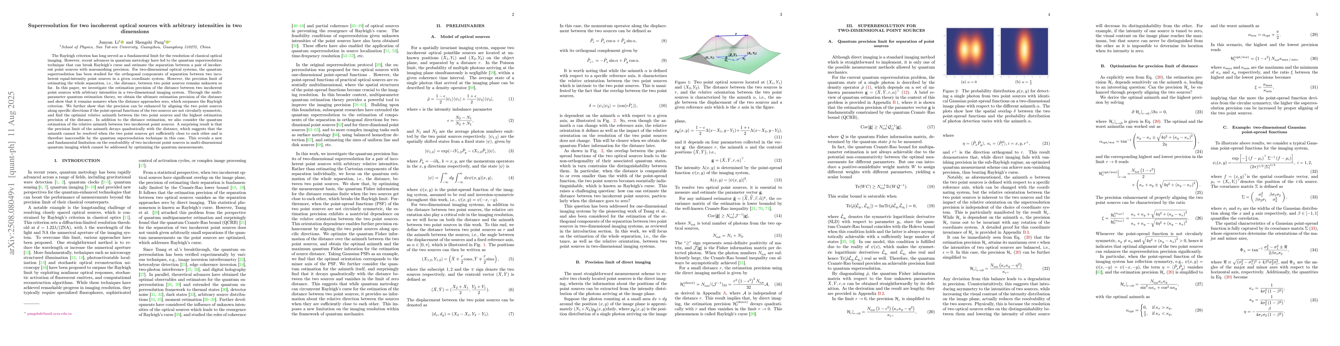 The Rayleigh criterion has long served as a fundamental limit for the resolution of classical optical imaging. However, recent advances in quantum metrology have led to the quantum superresolution technique that can break Rayleigh's curse and estimate the separation between a pair of incoherent point sources with nonvanishing precision. For two-dimensional optical systems, the precision limit of estimating the whole separation, i.e., the distance, between two point sources remains unknown so far. In this paper, we investigate the estimation precision of the distance between two incoherent point sources with arbitrary intensities in a two-dimensional imaging system. Through the multiparameter quantum estimation theory, we obtain the ultimate estimation precision of the distance and show that it remains nonzero when the distance approaches zero, which surpasses the Rayleigh criterion. We further show that the precision can be enhanced by aligning the two point sources along specific directions if the point-spread functions of the two sources are not circularly symmetric, and find the optimial relative azimuth between the two point sources and the highest estimation precision of the distance. In addition to the distance estimation, we also consider the quantum estimation of the relative azimuth between two incoherent point sources. A surprising result is that the precision limit of the azimuth decays quadratically with the distance, which suggests that the azimuth cannot be resolved when the two point sources get sufficiently close to each other and is therefore inaccessible by the quantum superresolution technique in this case. This reveals a new and fundamental limitation on the resolvability of two incoherent point sources in multi-dimensional quantum imaging which cannot be addressed by optimizing the quantum measurements.