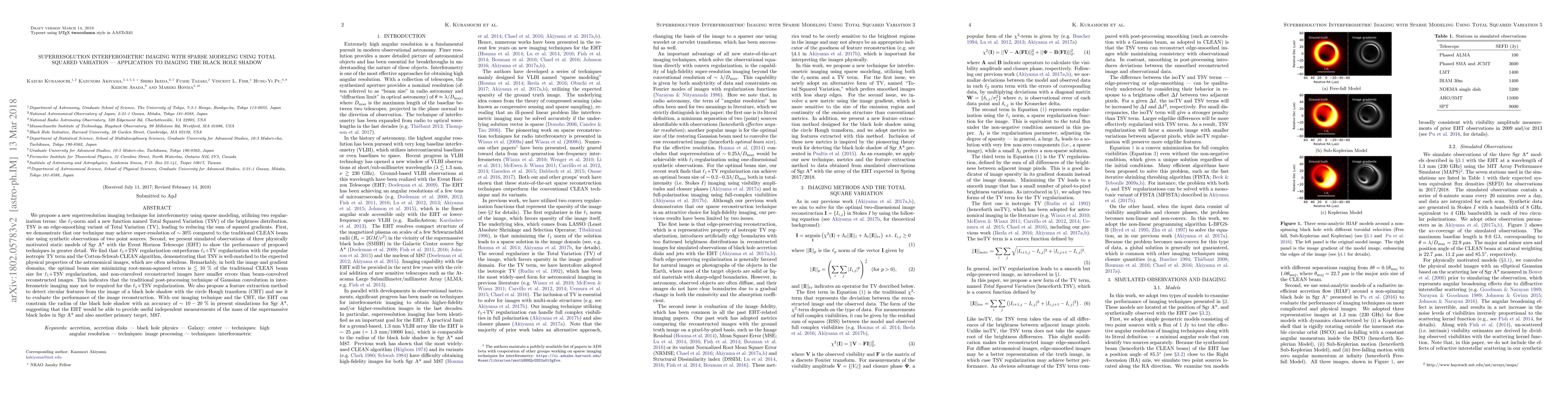 We propose a new superresolution imaging technique for interferometry using sparse modeling, utilizing two regularization terms: the $\ell_1$-norm and a new function named Total Squared Variation (TSV) of the brightness distribution. TSV is an edge-smoothing variant of Total Variation (TV), leading to reducing the sum of squared gradients. First, we demonstrate that our technique may achieve super-resolution of $\sim 30$% compared to the traditional CLEAN beam size using synthetic observations of two point sources. Second, we present simulated observations of three physically motivated static models of Sgr A* with the Event Horizon Telescope (EHT) to show the performance of proposed techniques in greater detail. We find that $\ell_1$+TSV regularization outperforms $\ell_1$+TV regularization with the popular isotropic TV term and the Cotton-Schwab CLEAN algorithm, demonstrating that TSV is well-matched to the expected physical properties of the astronomical images, which are often nebulous. Remarkably, in both the image and gradient domains, the optimal beam size minimizing root-mean-squared errors is $\lesssim 10$% of the traditional CLEAN beam size for $\ell_1$+TSV regularization, and non-convolved reconstructed images have smaller errors than beam-convolved reconstructed images. This indicates that the traditional post-processing technique of Gaussian convolution in interferometric imaging may not be required for the $\ell_1$+TSV regularization. We also propose a feature extraction method to detect circular features from the image of a black hole shadow with the circle Hough transform (CHT) and use it to evaluate the performance of the image reconstruction. With our imaging technique and the CHT, the EHT can constrain the radius of the black hole shadow with an accuracy of $\sim 10-20$% in present simulations for Sgr A*.