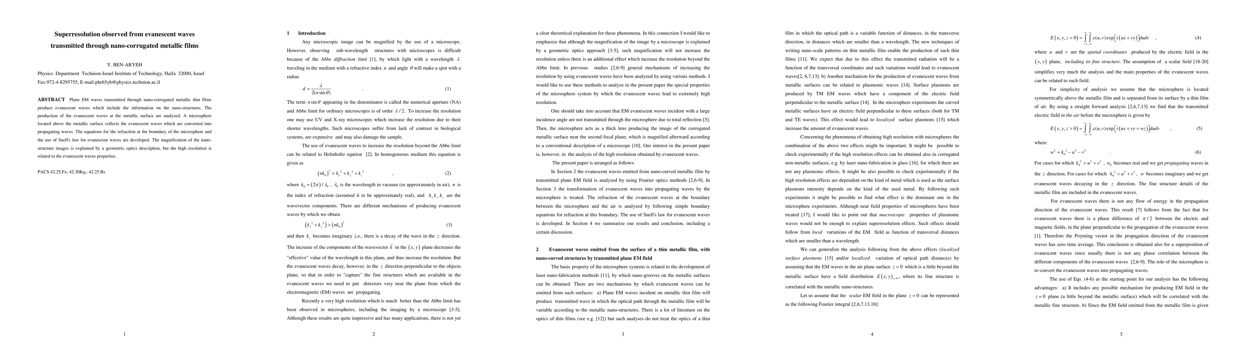 This paper investigates how plane EM waves transmitted through nano-corrugated metallic films generate evanescent waves that carry nano-structure information. The study develops equations for the refraction and conversion of these evanescent waves into propagating waves using a microsphere, explaining superresolution imaging through geometric optics and evanescent wave properties.