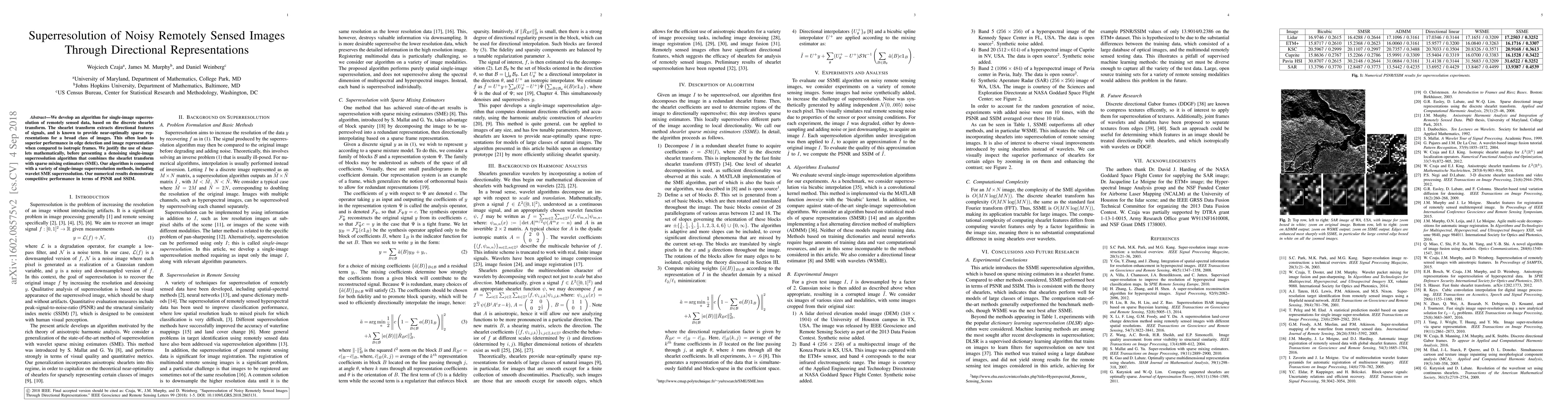 This paper proposes an algorithm for single-image superresolution of remotely sensed images using the discrete shearlet transform, which provides near-optimal sparse representations of directional features. The algorithm combines shearlet transforms with sparse mixing estimators, achieving competitive results in terms of PSNR and SSIM compared to other methods.