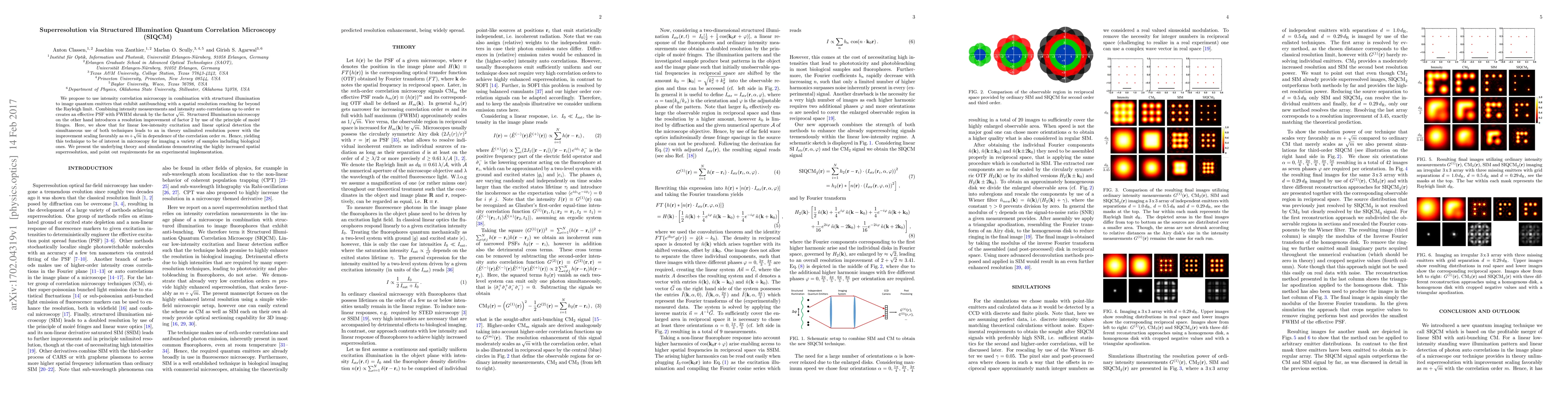 We propose to use intensity correlation microscopy in combination with structured illumination to image quantum emitters that exhibit antibunching with a spatial resolution reaching far beyond the Rayleigh limit. Combining intensity measurements and intensity auto correlations up to order $m$ creates an effective PSF with FWHM shrunk by the factor $\sqrt{m}$. Structured Illumination microscopy on the other hand introduces a resolution improvement of factor 2 by use of the principle of moir\'e fringes. Here, we show that for linear low-intensity excitation and linear optical detection the simultaneous use of both techniques leads to an in theory unlimited resolution power with the improvement scaling favorably as $m + \sqrt{m}$ in dependence of the correlation order $m$. Hence, yielding this technique to be of interest in microscopy for imaging a variety of samples including biological ones. We present the underlying theory and simulations demonstrating the highly increased spatial superresolution, and point out requirements for an experimental implementation.