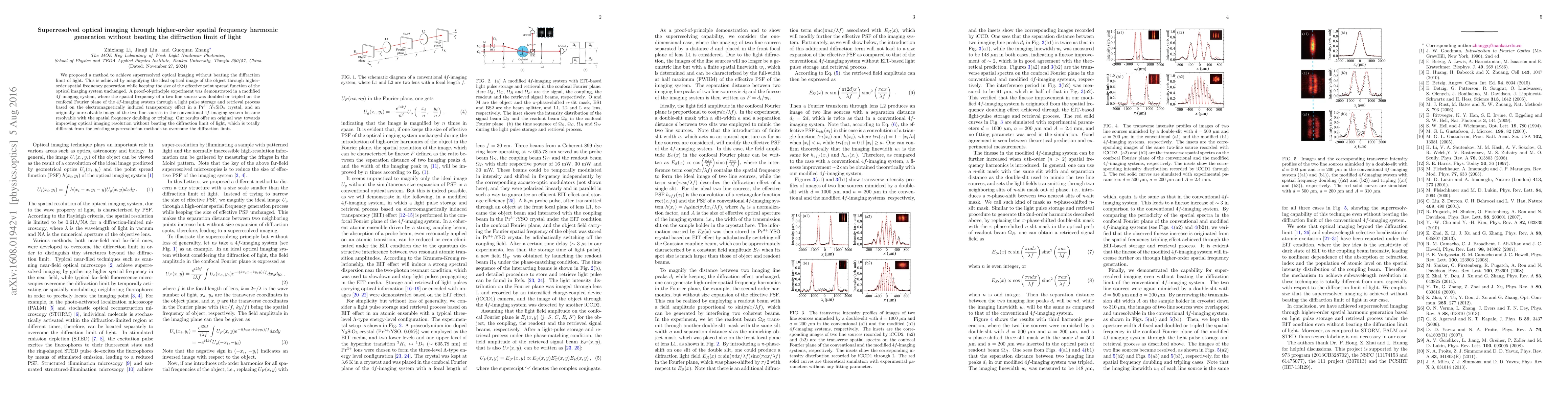 We proposed a method to achieve superresolved optical imaging without beating the diffraction limit of light. This is achieved by magnifying the ideal optical image of the object through higher-order spatial frequency generation while keeping the size of the effective point spread function of the optical imaging system unchanged. A proof-of-principle experiment was demonstrated in a modified $4f$-imaging system, where the spatial frequency of a two-line source was doubled or tripled on the confocal Fourier plane of the $4f$-imaging system through a light pulse storage and retrieval process based on the electromagnetically induced transparency effect in a Pr$^{3+}$:$\rm Y_2SiO_5$ crystal, and an originally unresolvable image of the two line sources in the conventional $4f$-imaging system became resolvable with the spatial frequency doubling or tripling. Our results offer an original way towards improving optical imaging resolution without beating the diffraction limit of light, which is totally different from the existing superresolution methods to overcome the diffraction limit.
