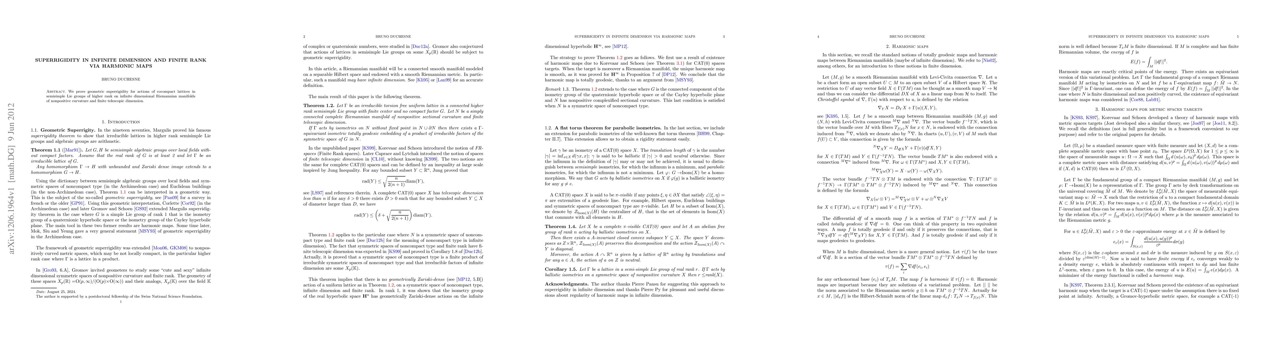 Summary: This paper establishes geometric superrigidity for cocompact lattices in higher-rank semisimple Lie groups acting on infinite-dimensional Riemannian manifolds with nonpositive curvature and finite telescopic dimension through harmonic maps. The result leverages the properties of these manifolds to ensure the rigidity of the group actions.
